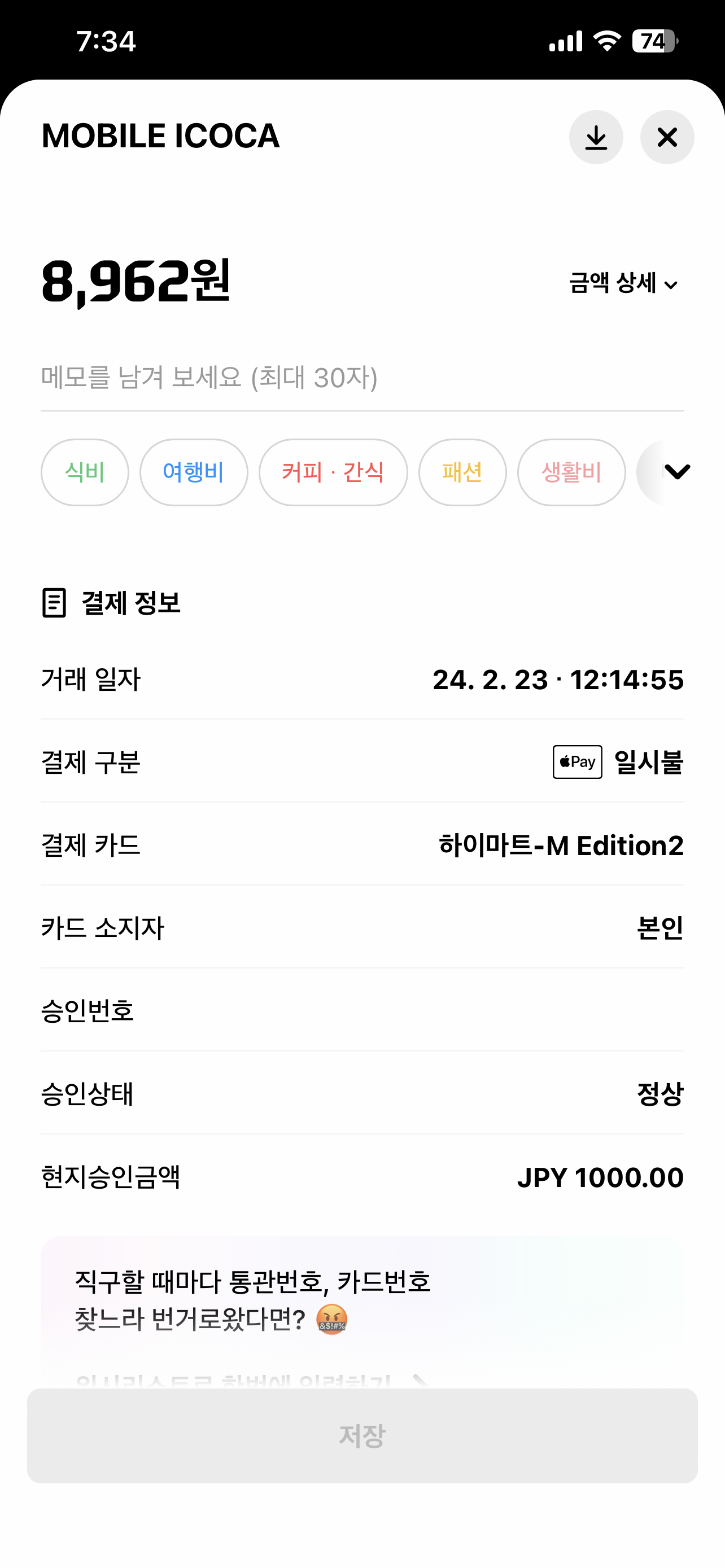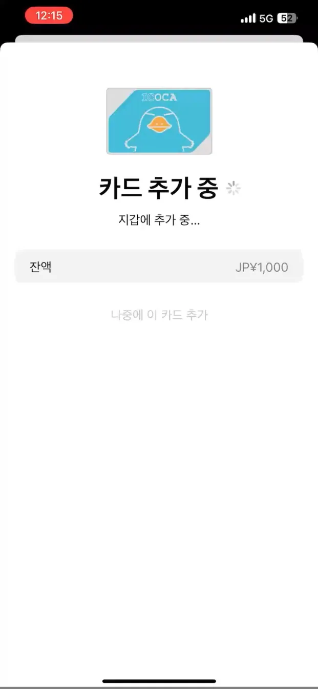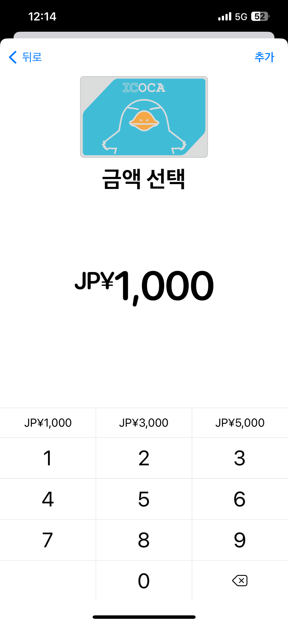 최소 ¥1,000 이상을 충전해야만 아이폰 지갑에 일본 교통카드를 추가할 수 있는데, 이 충전을 현재로서는 현대카드(마스터카드)로만 진행할 수 있습니다.