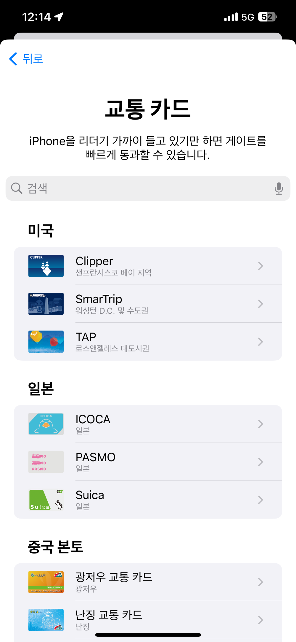 미국/일본/중국 본토의 교통 카드를 추가할 수 있는데, 다른 곳들은 당장 제가 갈 일이 없으니, 일본을 선택하겠습니다.