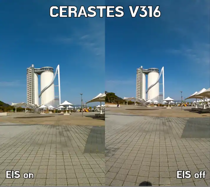 CERASTES V316 액션캠을 손으로 들고서 평상시처럼 걸어봤는데요, EIS를 켜고 껐을 때의 차이가 제법 있는 것을 알 수 있습니다.