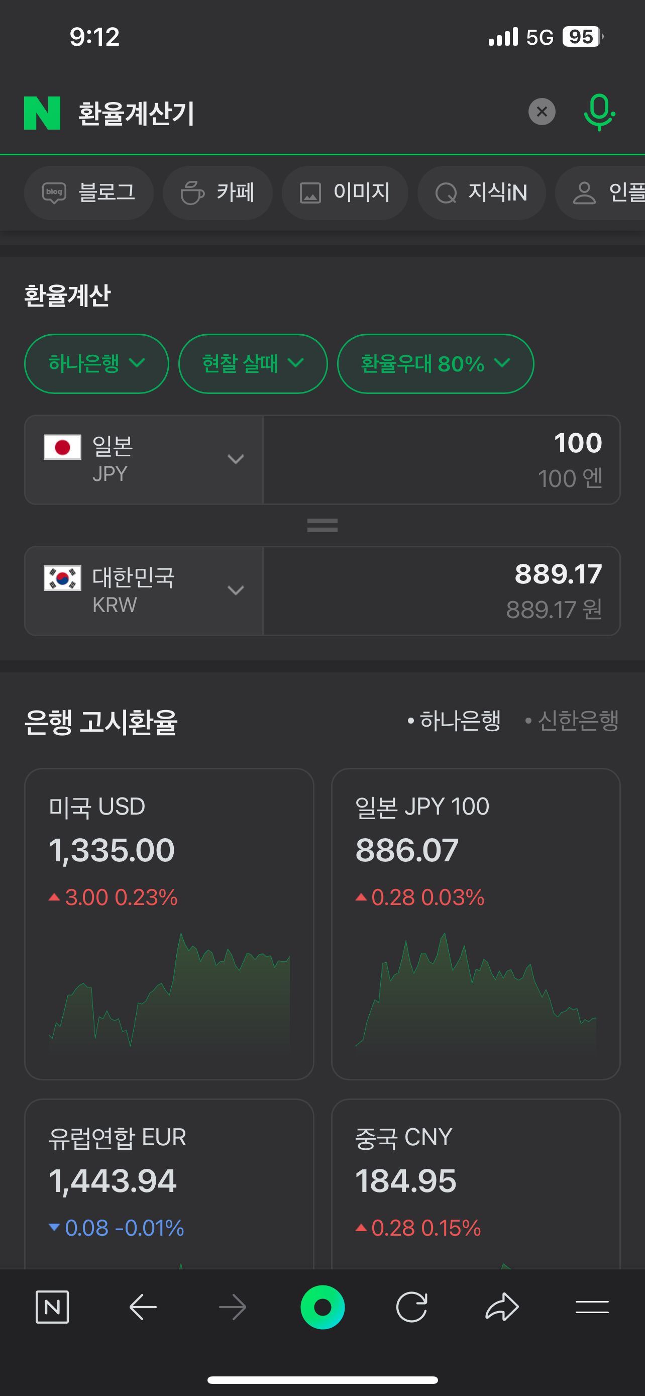우리가 하나은행에서 엔화를 환전하게 될 경우 환율 우대율이 80%이기 때문에 ¥100 당 889.17원을 주고 엔화를 구입하게 됩니다.
