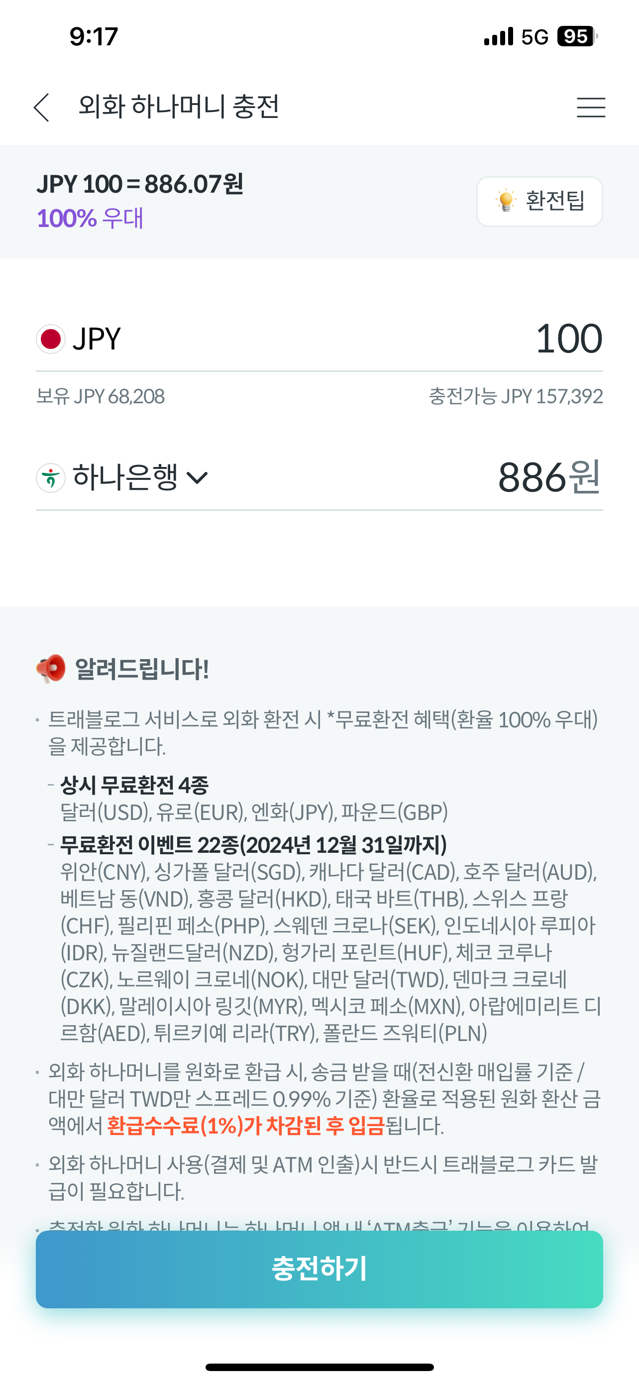 반면, 트래블로그 체크카드에 엔화를 충전할 경우, 환율우대율이 100%라서 ¥100당 886원에 구입이 가능합니다.