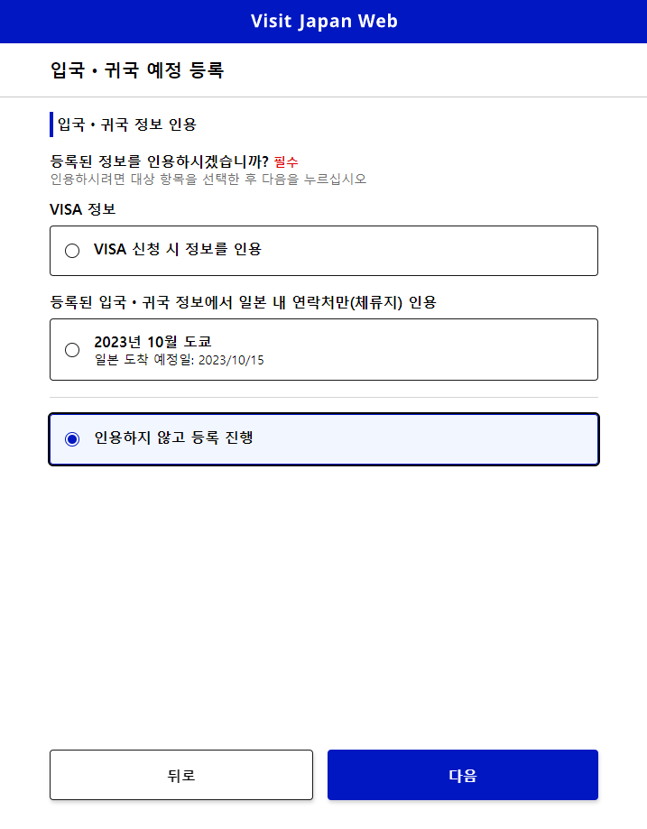 지난 번처럼 도쿄에 들르고, 같은 호텔에 머무를 예정이었다면 지난 정보에서 불러오기를 했겠지만, 이번에는 오사카로 떠나게 되므로 [인용하지 않고 등록 진행]을 눌러 줬습니다.