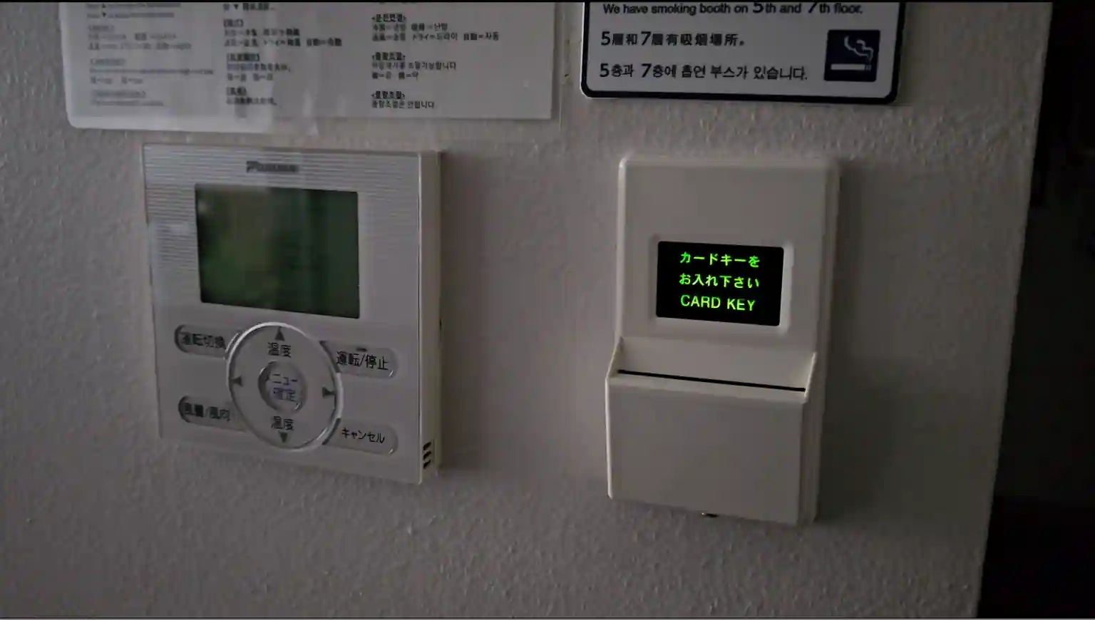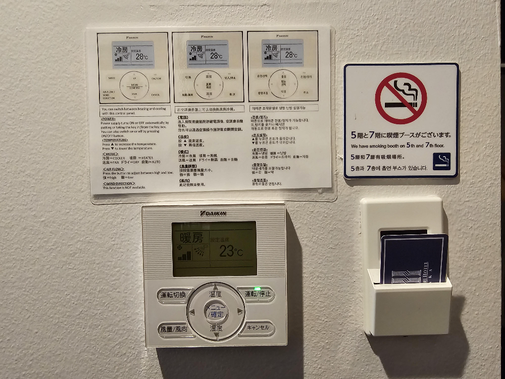 객실 카드키 꽃는 곳 옆에 객실 온도를 조절할 수 있는 스위치가 부착되어 있습니다.