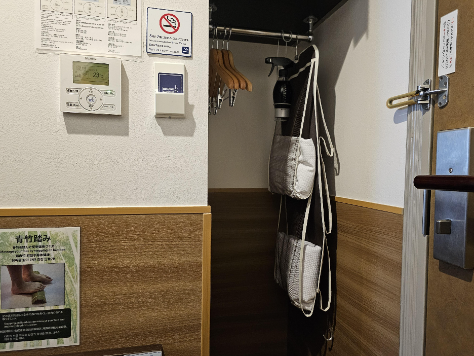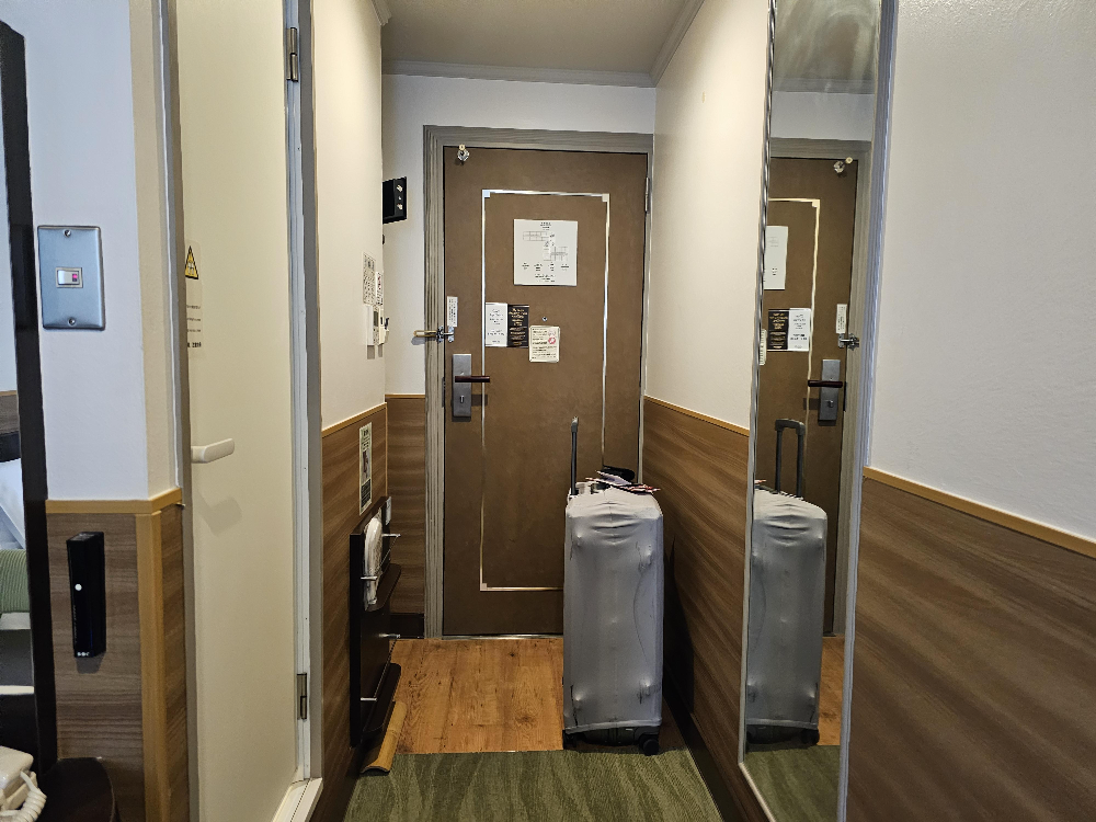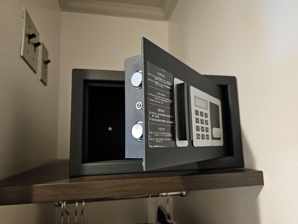 문을 열고 객실로 들어서면 바로 옆에 옷을 걸어 둘 수 있는 작은 행거와 미니 금고가 보입니다.