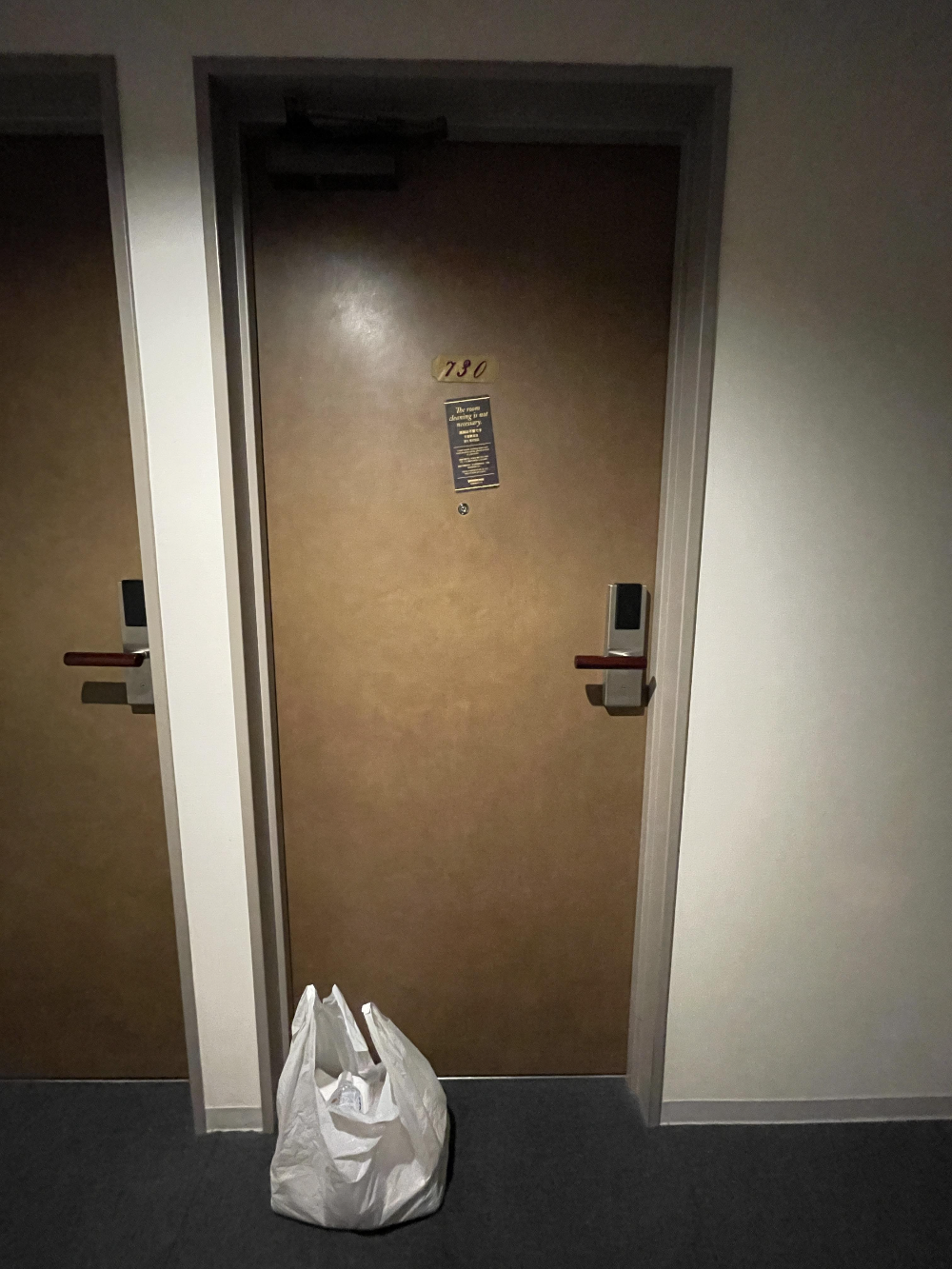 청소가 필요없다고 할 경우, 객실 문 앞에 위 사진처럼 수건과 생수를 담은 비닐봉지를 두고 갑니다.