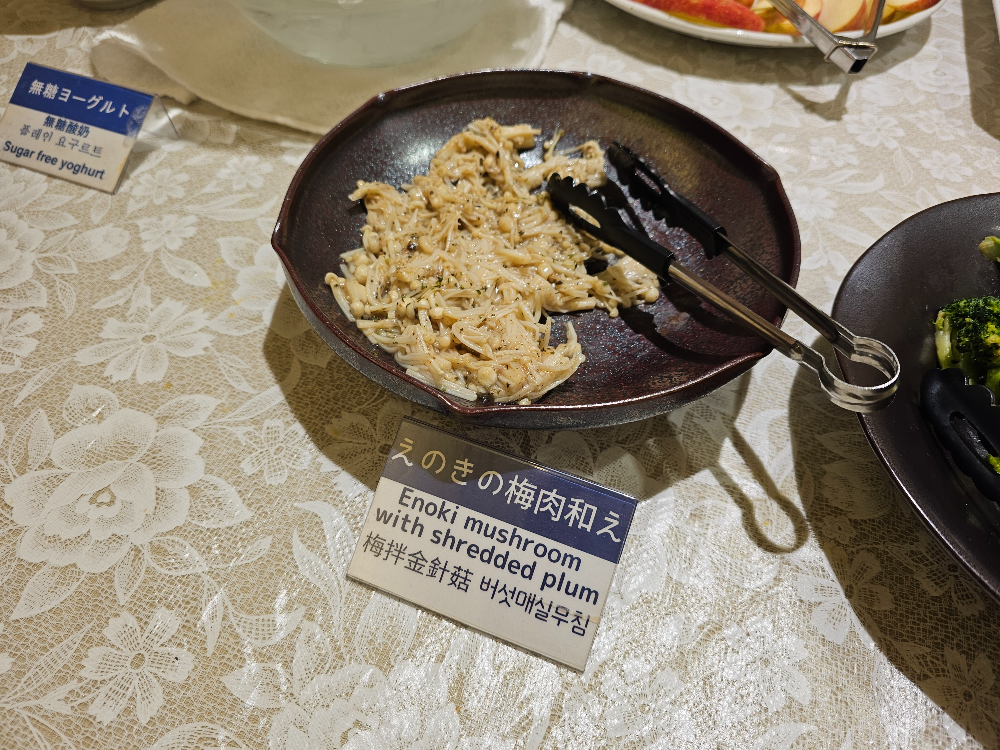 스크램블 에그, 페퍼론치노 오일 파스타, 토란 조림, 버섯 매실 무침, 브로콜리 버터 볶음, 마카로니 샐러드, 야채 샐러드, 참깨 드레싱, 프렌치 드레싱, 들깨 드레싱, 오렌지, 사과, 비엔나 소시지, 감자튀김, 베이컨, 플레인 요구르트, 망고푸딩, 초콜릿 무스, 생선 초밥, 고등어 구이, 생선 구이, 야채찜, 잔치국수, 삼각김밥, 낫토, 김, 삶은 계란, 고기스프, 된장국...