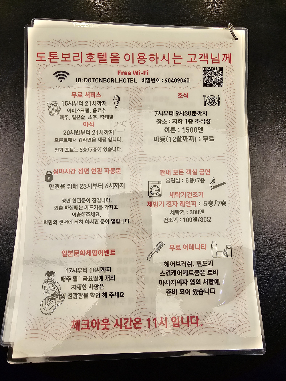 다만, 도톤보리 호텔 공식 홈페이지를 통해서 예약을 하게 될 경우 무료로 1시간 늦은 12시까지 체크아웃이 가능합니다.