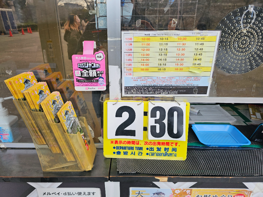 오사카성을 제대로 돌아보지 않으면 오사카 여행을 하지 않은 것 같다... 뭐 이런 생각이 들어서 2시 30분 승선권을 받아왔습니다. 그나마 이 것도 참 운이 좋았던 게, 제가 마지막 손님이었고 제가 발권하고 나니 바로 2시 45분으로 바뀌더라고요.