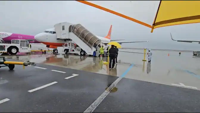 11시 27분. 탑승 게이트가 열렸고, 11시 41분 우산을 빌려쓰고 비행기까지 걸어서 이동했습니다.