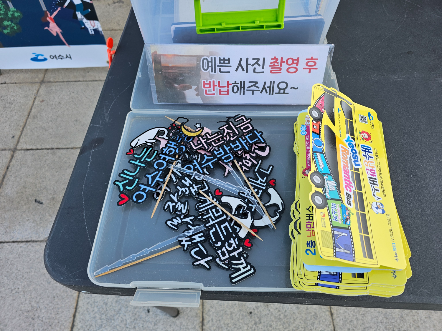 접수 확인처에는 이렇게 여수여행 관련 토퍼가 놓여져 있는데, 이걸 빌려서 이 일대에서 재밌는 인증 사진도 촬영할 수 있습니다.