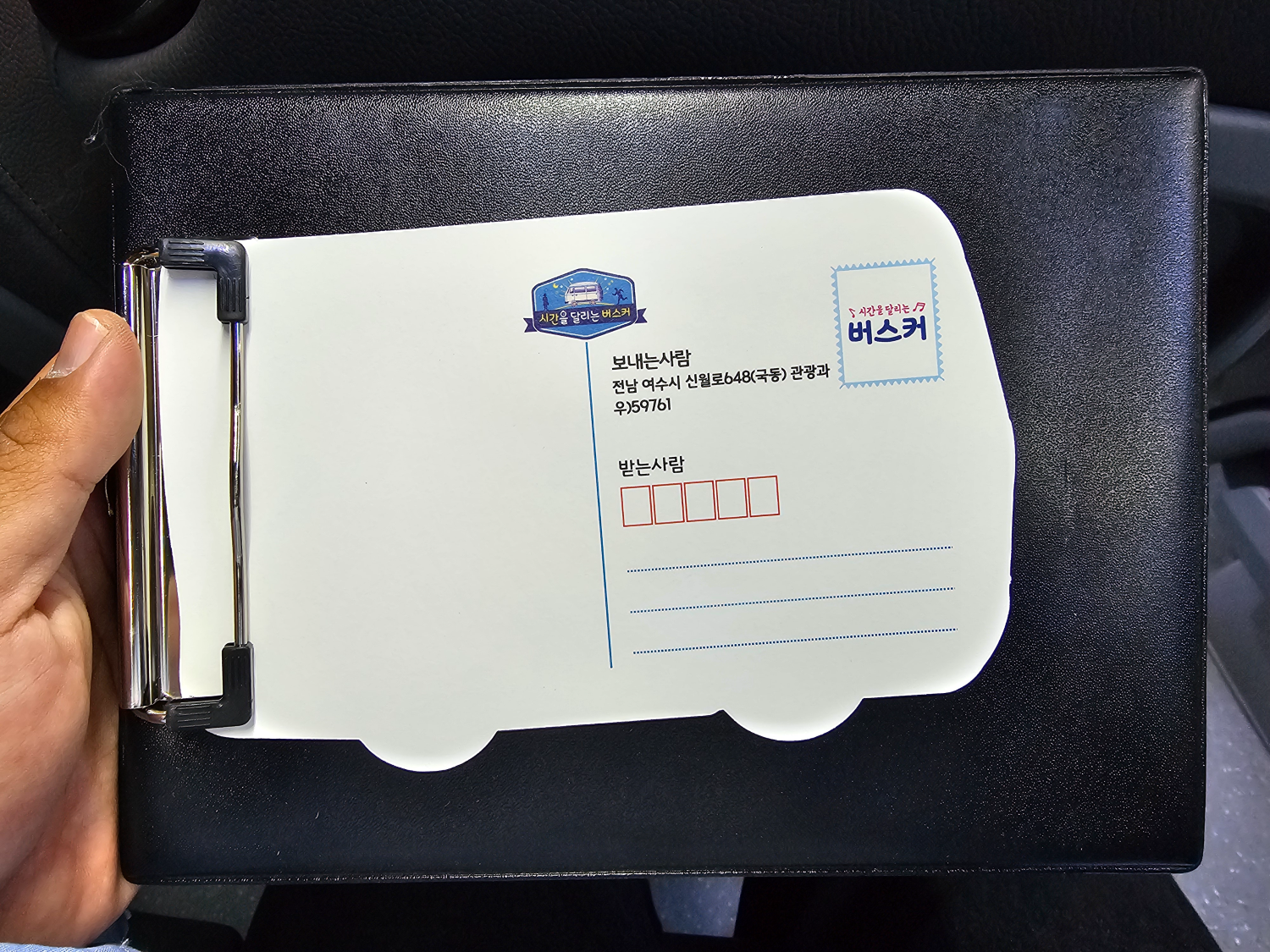 소호요트경기장에서 다시 버스에 오르니 자리마다 버스를 꼭 빼닮은 엽서가 놓여 있었습니다.
