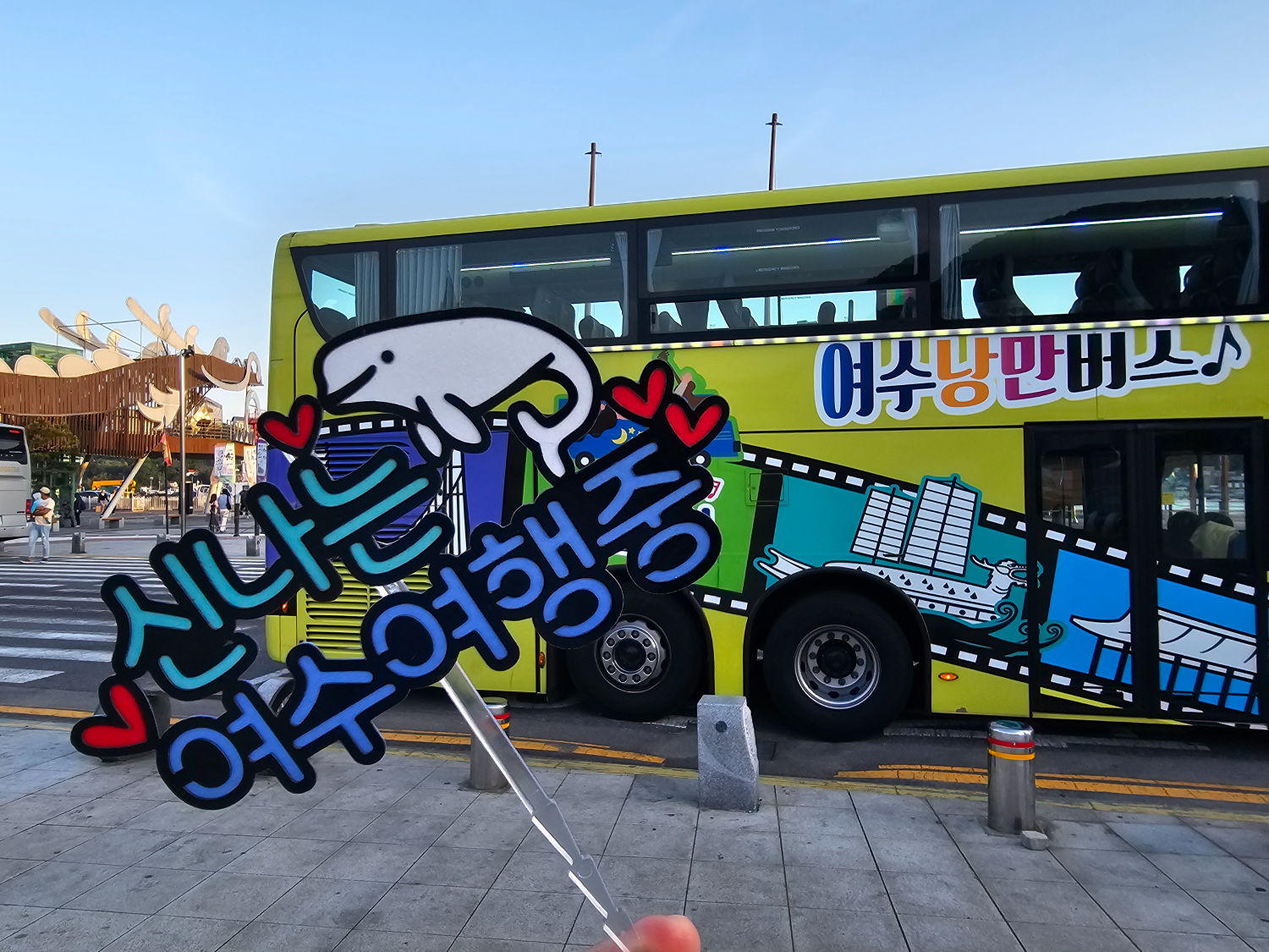 신나는 버스킹 공연과 함께 버스는 소호동동다리에서 선소대교를 건너 돌산대교를 지나고, 거북선대교와 여수엑스포해양공원 인근을 거쳐서 이순신광장으로 이동했습니다.