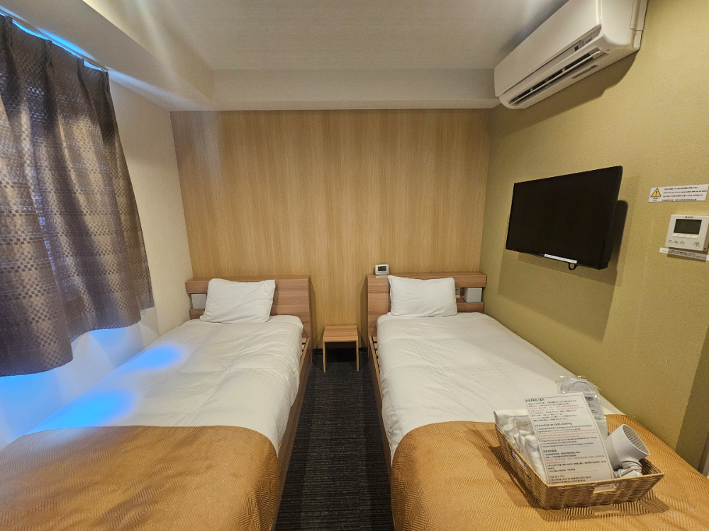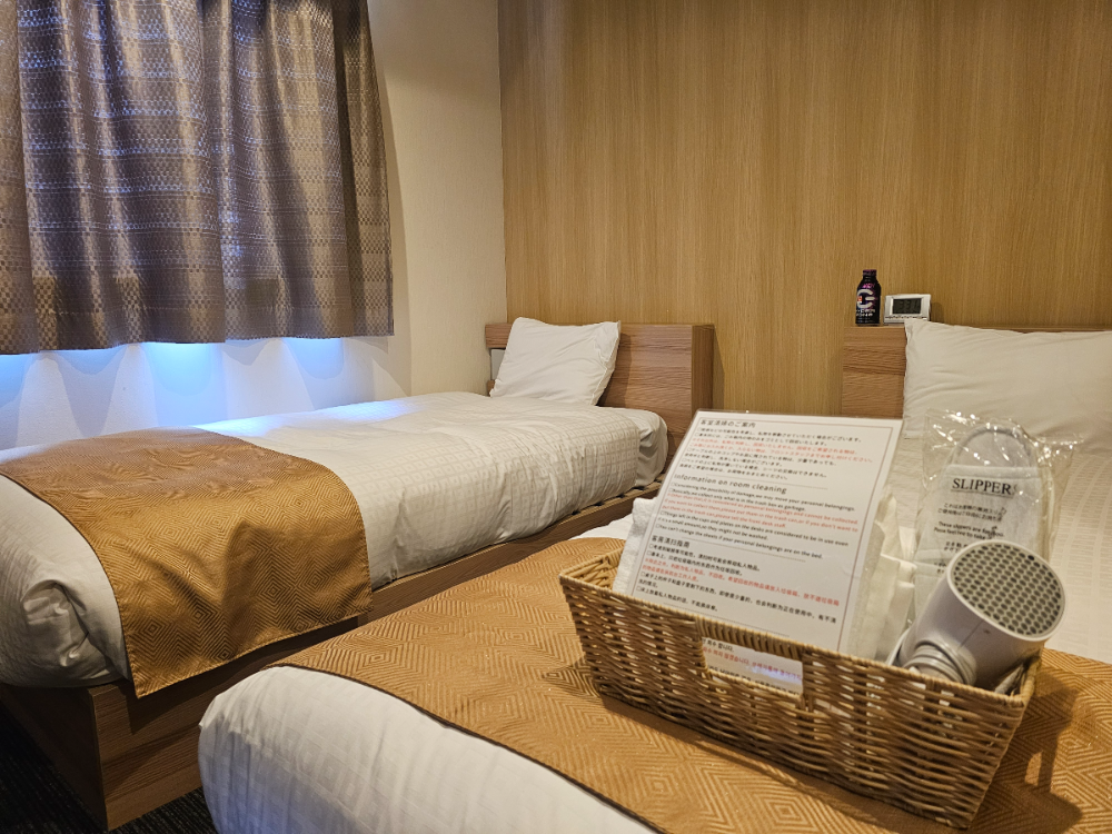 대다수 일본의 비즈니스 호텔들이 그러하듯, 프런트 데스크에서 필요한 어메니티를 직접 챙겨가야 하고, 손톱깎이나 체온계, 바느질 세트나 충전기 등 일부 물품을 프런트 데스크에 요청하여 대여할 수 있습니다.