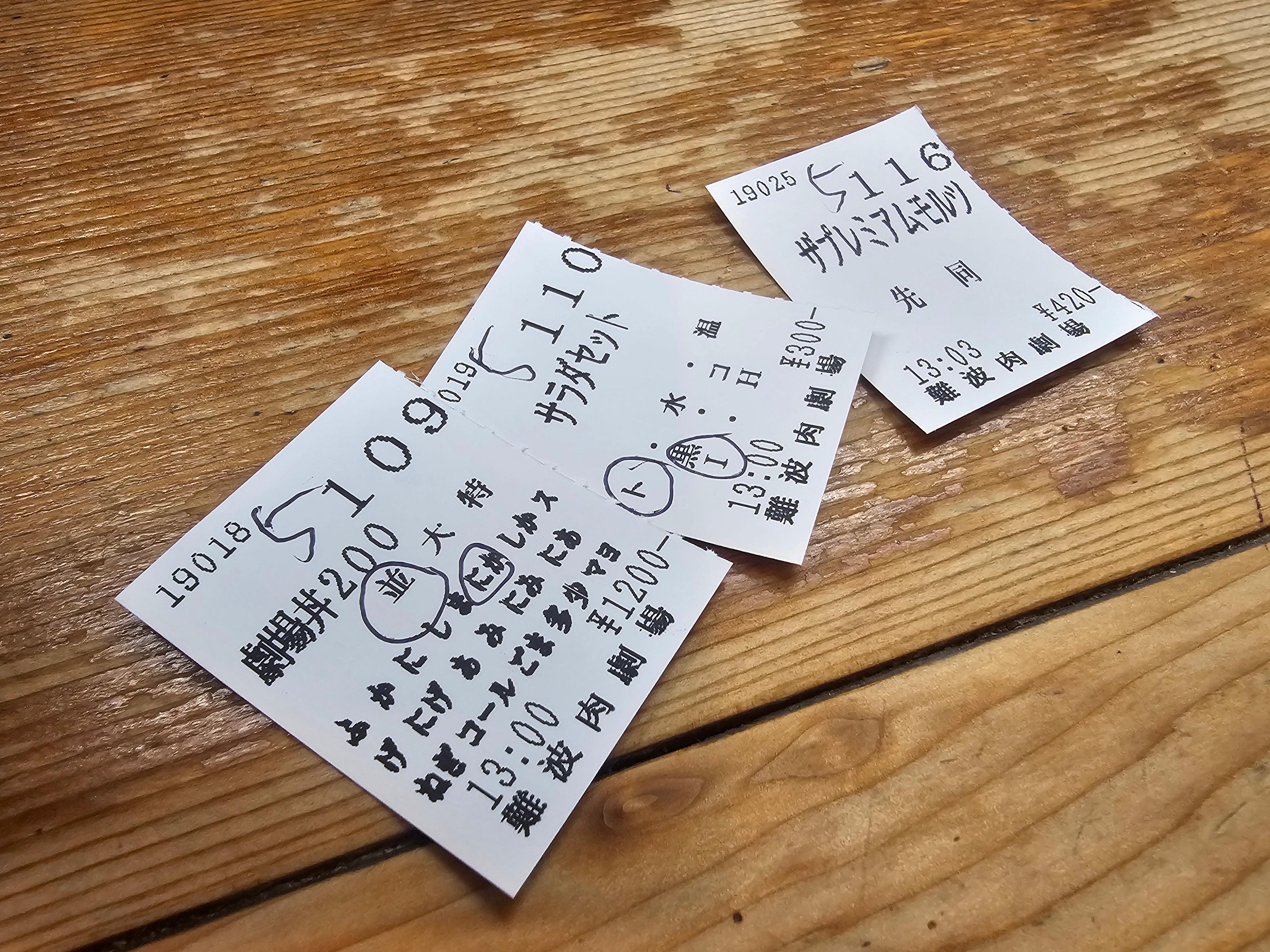 위 이미지는 제가 첫 방문했을 때 주문했던 메뉴들입니다. 3장의 식권이 보이는데, 각 각 劇場丼(극장덮밥), サラダセット(샐러드 세트), ザプレミアムモルツ(더 프리미엄 몰츠)라고 적혀 있습니다.