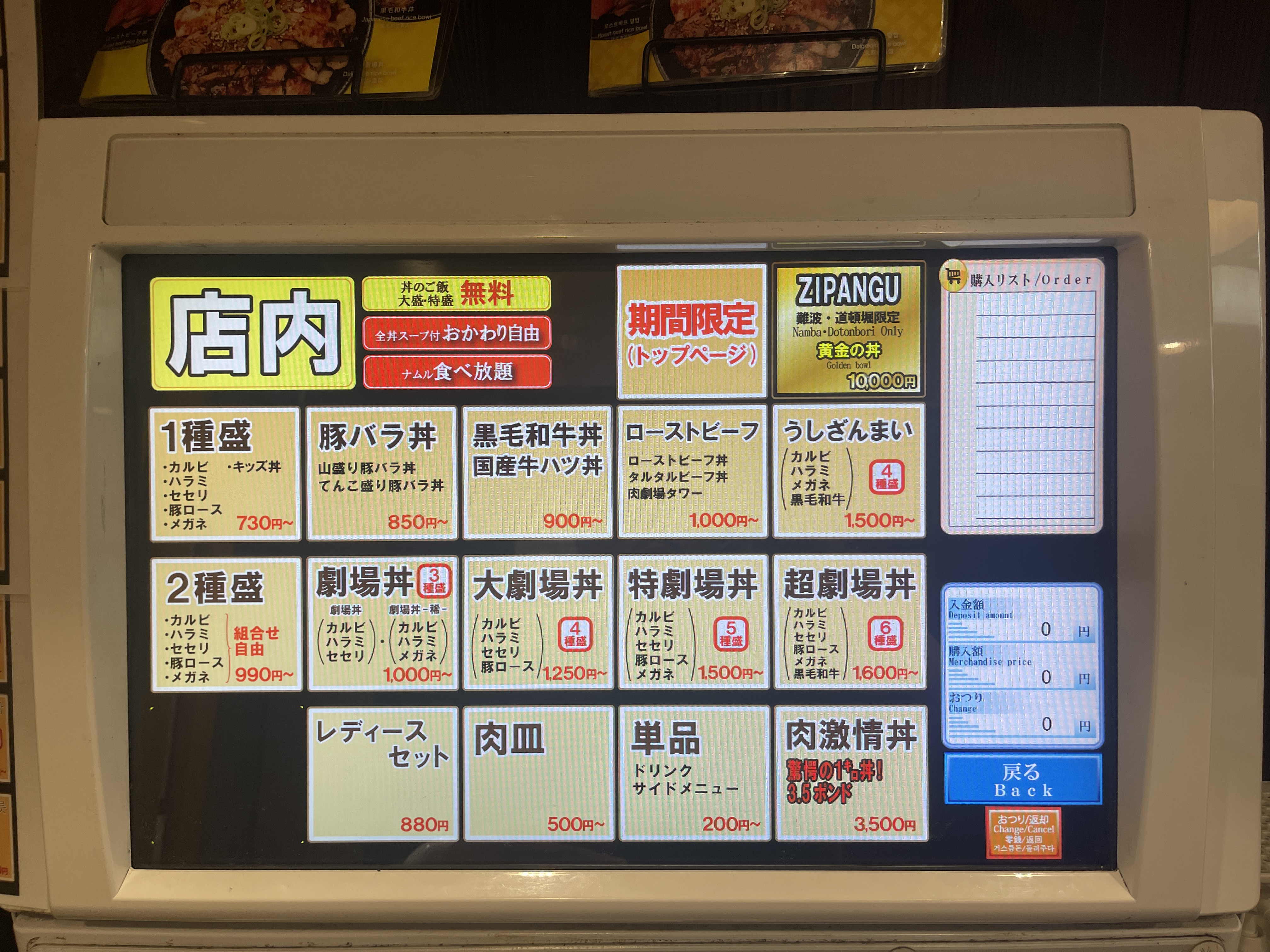 저는 고기극장을 두 번 방문했는데요, 첫 방문 때는 점심식사 시간을 조금 지난 상태에서 방문했었으나 여전히 사람들이 몰려서 뭘 주문했는지도 모를 정도로 긴장한 상태로 주문을 했고, 두 번째 방문 때에는 덴덴타운의 상점가들이 하나 둘 문을 닫기 시작하는 늦은 저녁 시간대에 방문해서 다행히 키오스크 화면을 하나하나 사진으로 찍어서 번역 어플을 이용해서 주문을 끝마칠 수 있었습니다.