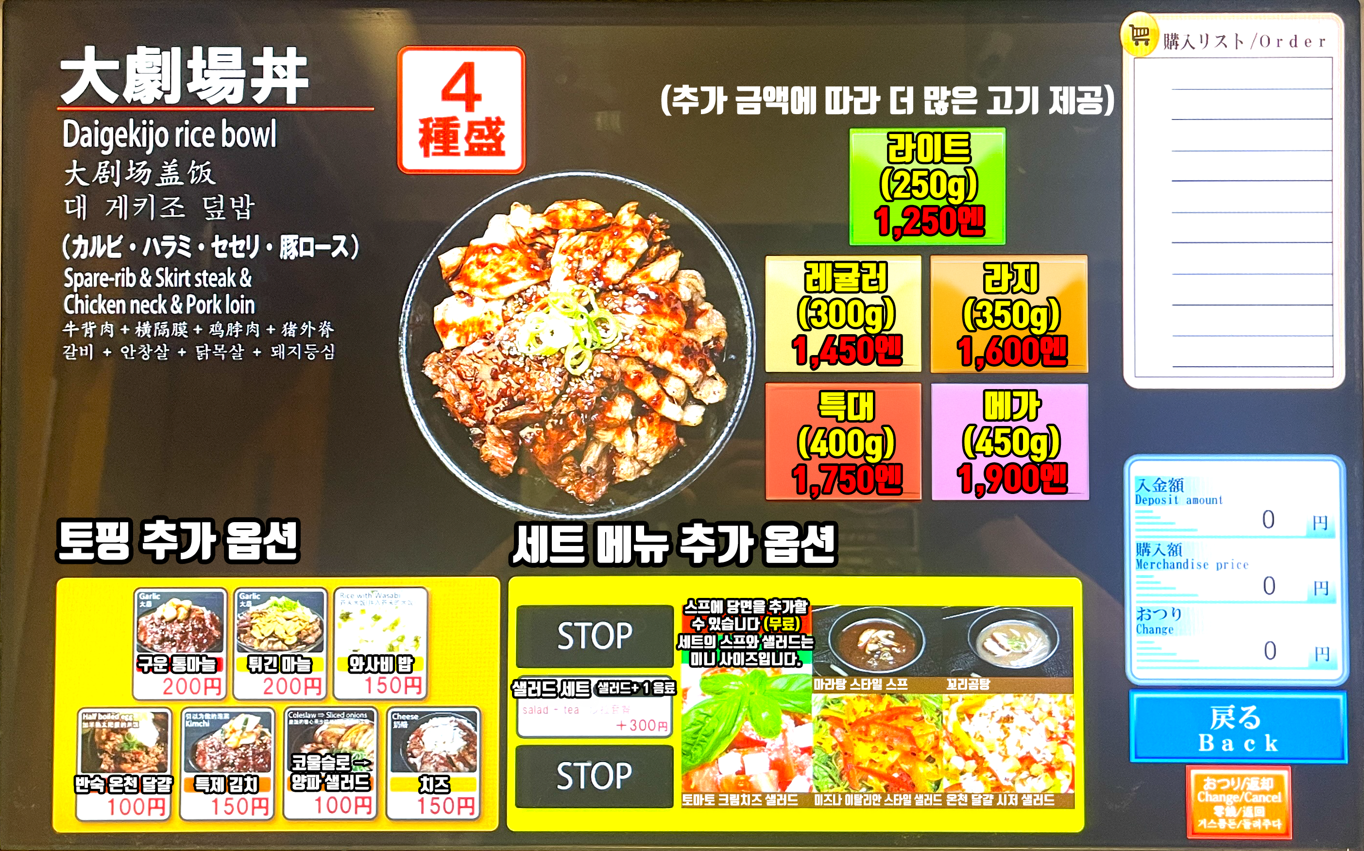 손님이라도 없는 곳이라면 천천히 파파고를 이용해서 번역을 해가며 주문을 시도하겠는데, 안타깝게도 제 뒤로도 사람들이 계속해서 줄을 서고 있었고, 한국인들만 서있었다면 어찌어찌 물어보거나 양해를 부탁하며 주문을 했겠지만, 이곳 고기극장은 일본 사람들도 즐겨 찾는 식당이었어서 그런 여유를 부릴 수가 없었습니다.