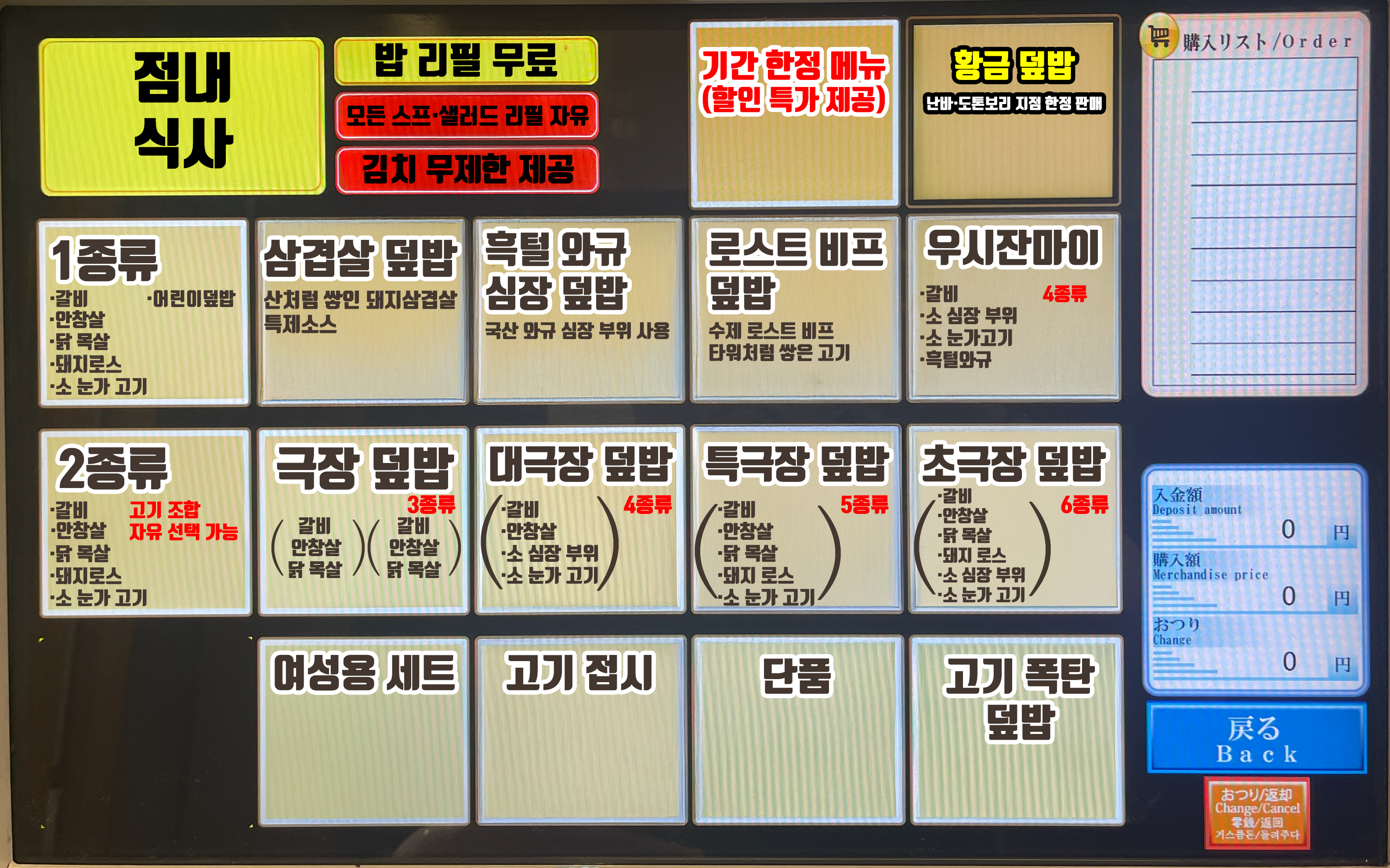 다음은 제가 힘겹게 촬영을 했던 고기극장 키오스크 화면을 번역한 모습입니다.