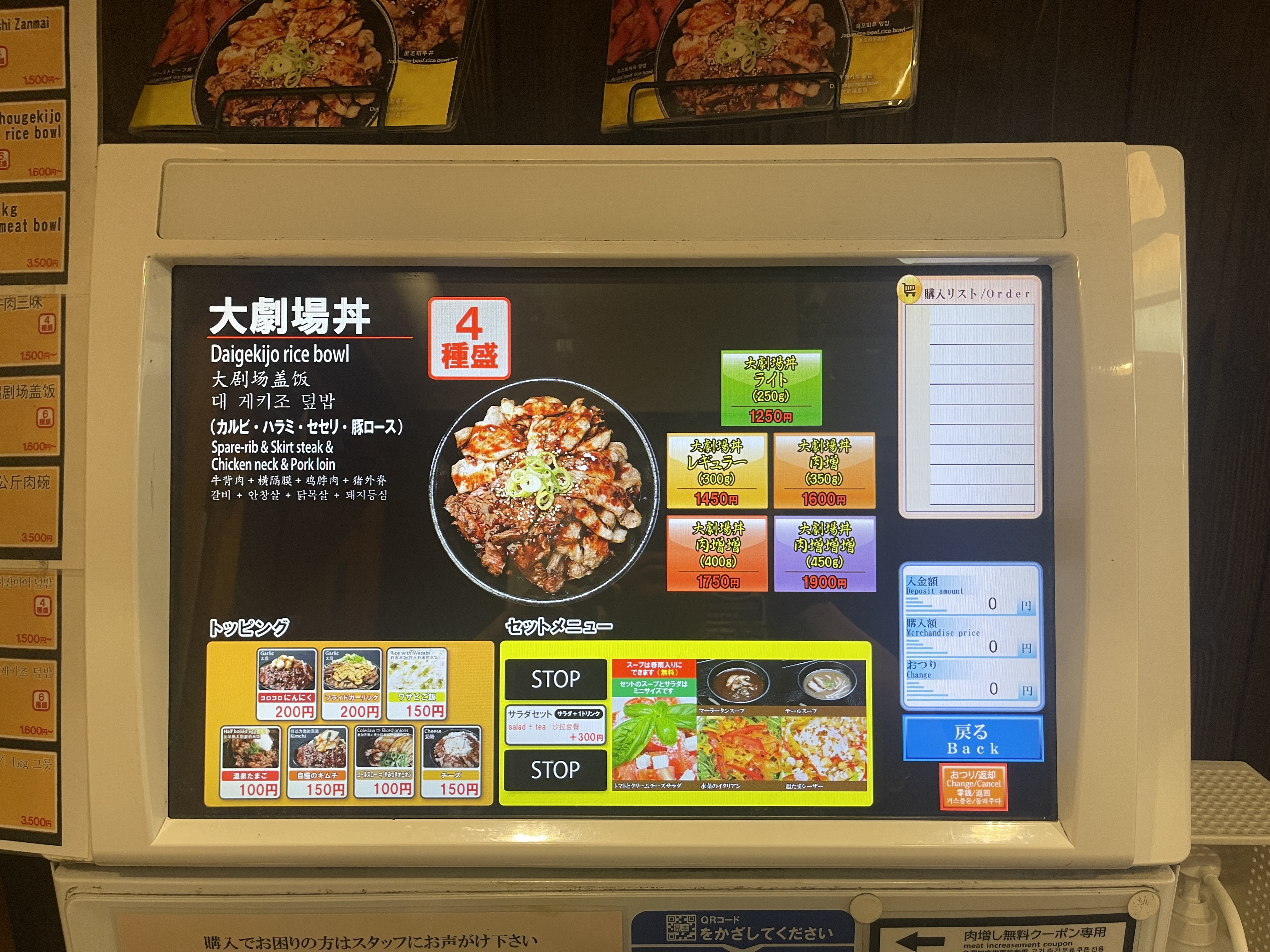 저는 고기극장을 두 번 방문했는데요, 첫 방문 때는 점심식사 시간을 조금 지난 상태에서 방문했었으나 여전히 사람들이 몰려서 뭘 주문했는지도 모를 정도로 긴장한 상태로 주문을 했고, 두 번째 방문 때에는 덴덴타운의 상점가들이 하나 둘 문을 닫기 시작하는 늦은 저녁 시간대에 방문해서 다행히 키오스크 화면을 하나하나 사진으로 찍어서 번역 어플을 이용해서 주문을 끝마칠 수 있었습니다.