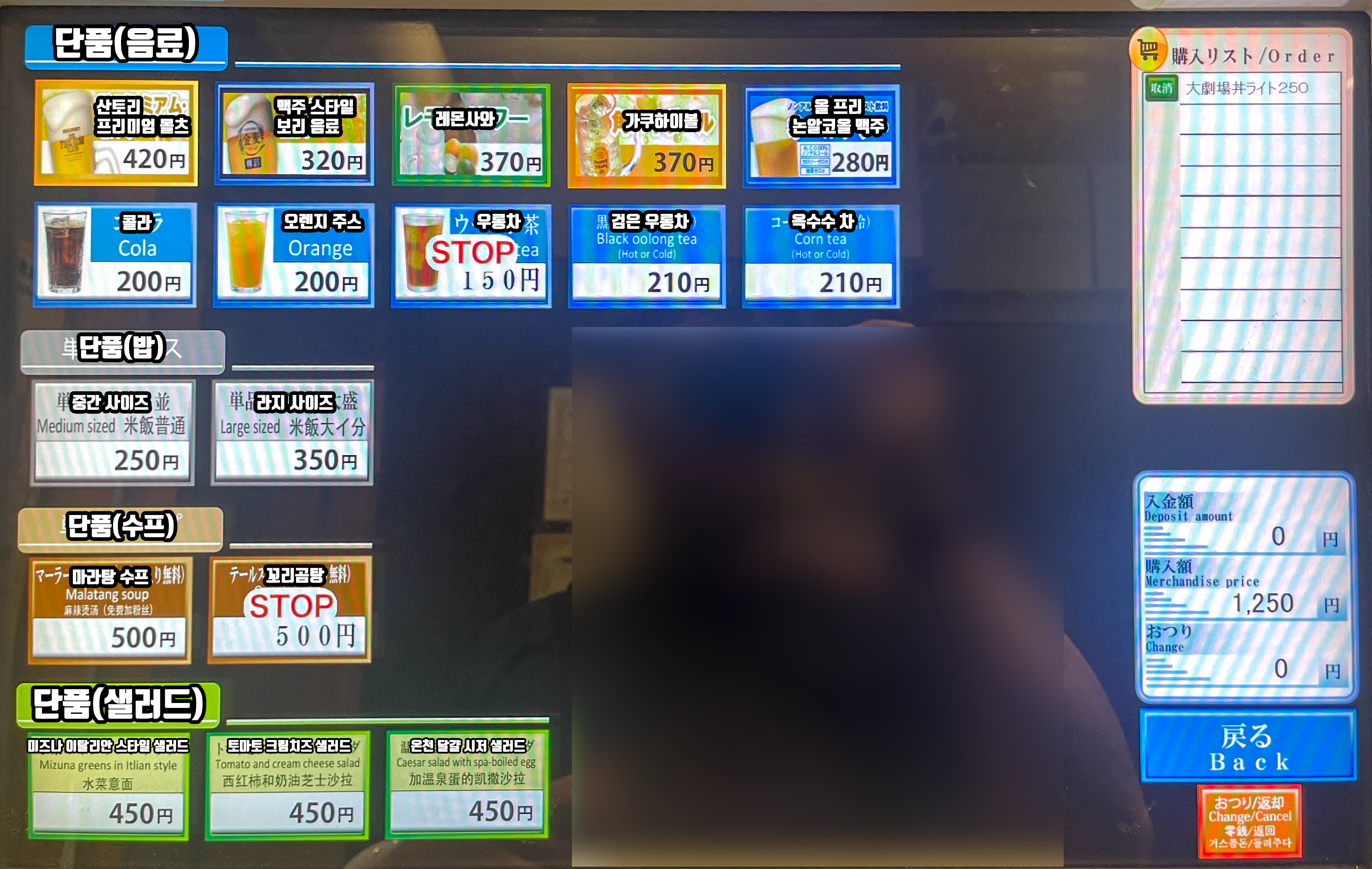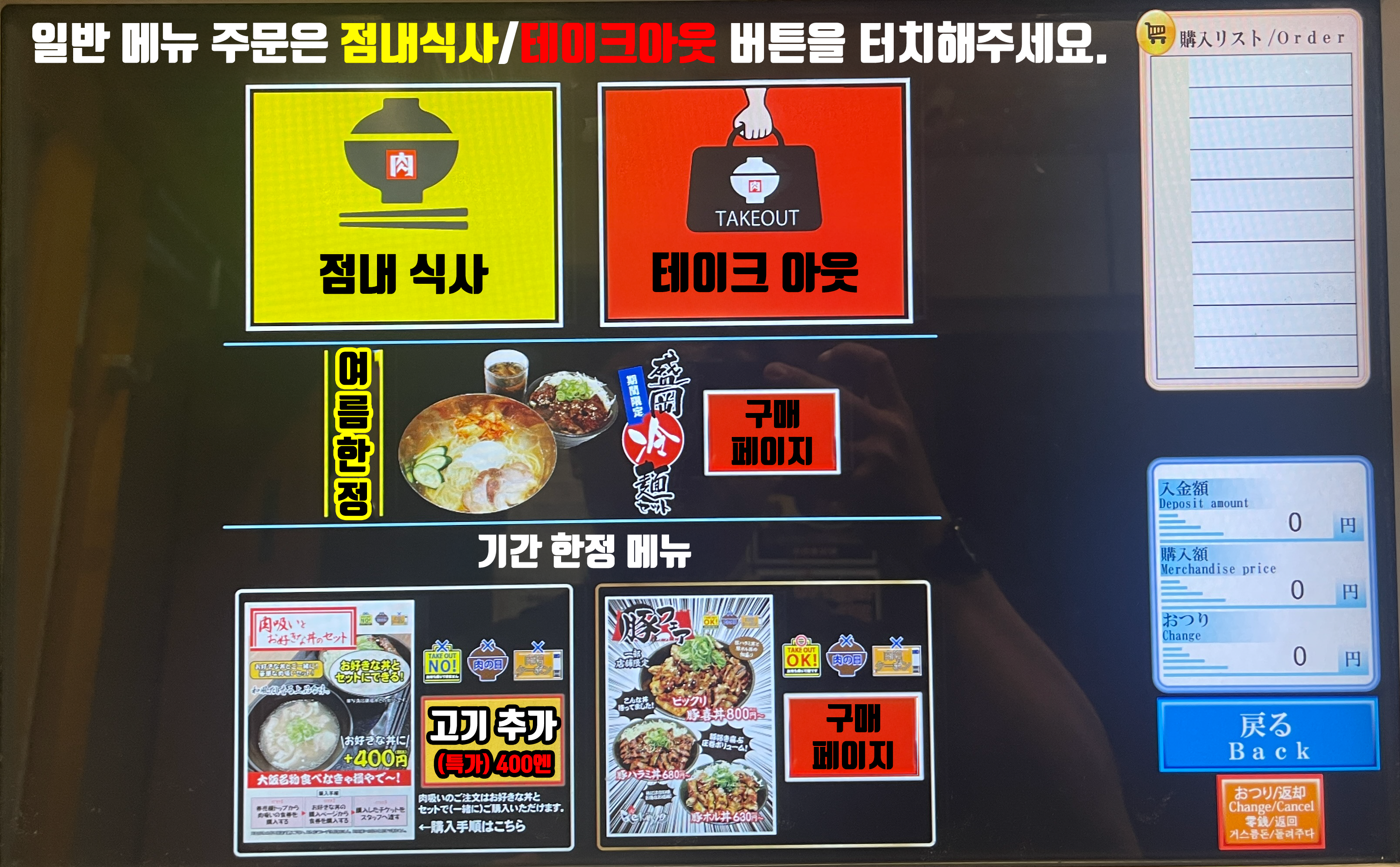 한국어 메뉴판을 건네주더라도 이 메뉴를 주문하려면 일본어로 된 키오스크를 상대해야 하는데, 이게 무슨 의미가 있나 싶습니다. 바쁘지 않다면 직원에게 도움을 요청해서 키오스크를 통해서 대신 주문을 부탁하겠지만, 직원은 바빠 보이고....