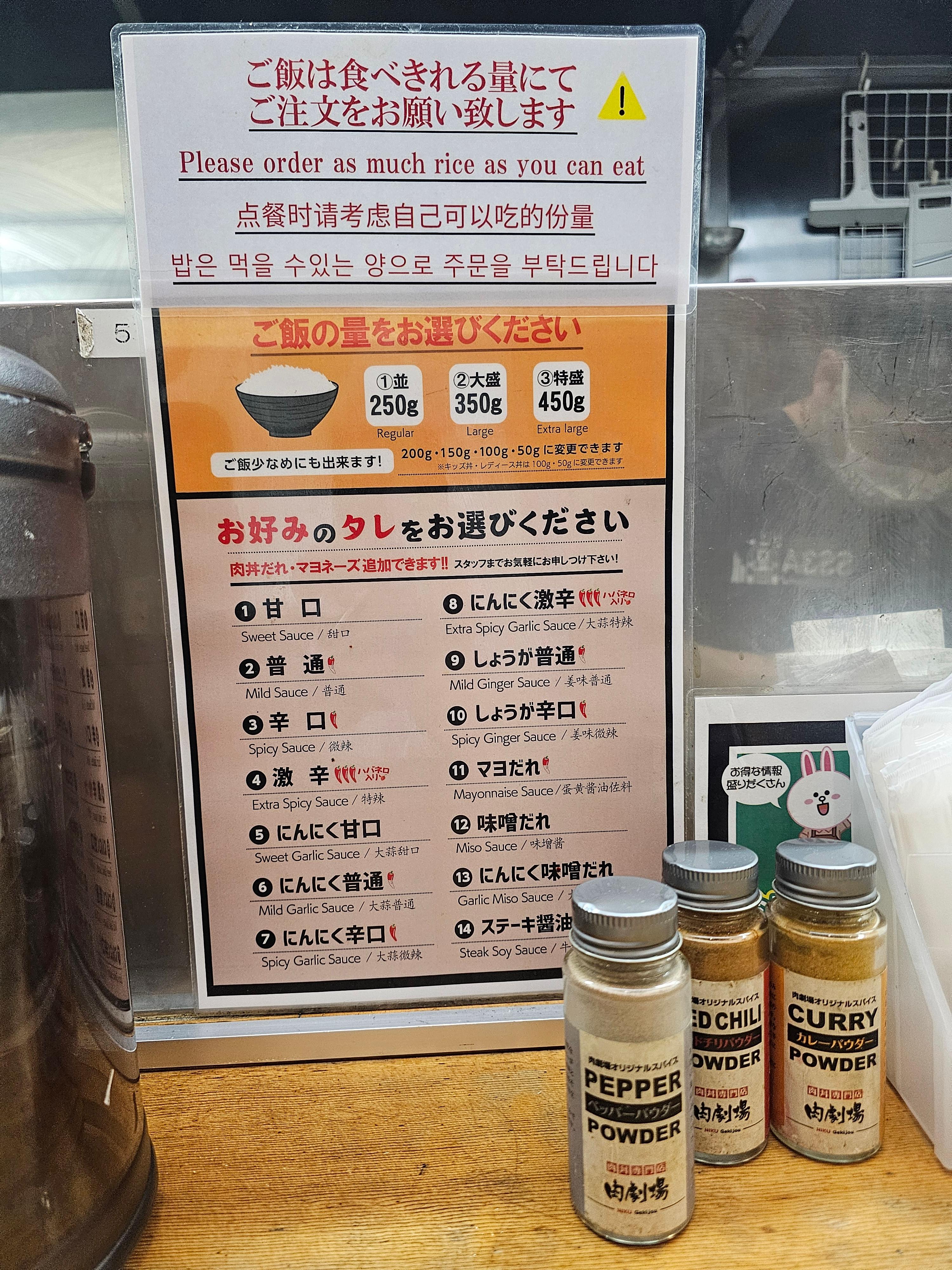 밥 양이나 소스, 샐러드 종류 등을 당연하게도 직원이 일본어를 물어보는데, 당황하지 말고, 자리 앞에 놓인 안내문을 보고서, 일본어를 잘 모를 경우 손가락으로 하나씩 선택해 주면 됩니다.