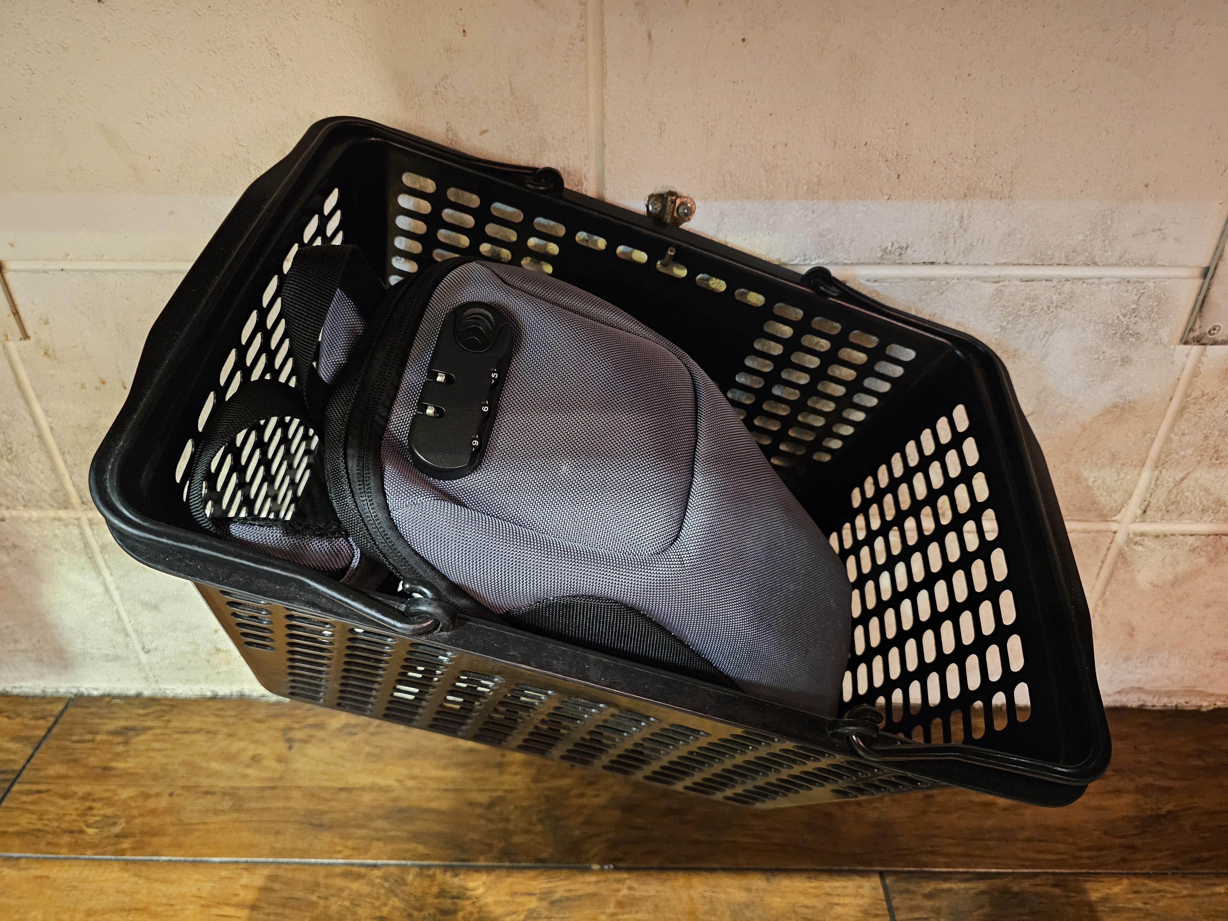 테이블 아래로 소지품을 보관할 수 있는 바구니가 놓여져 있습니다.