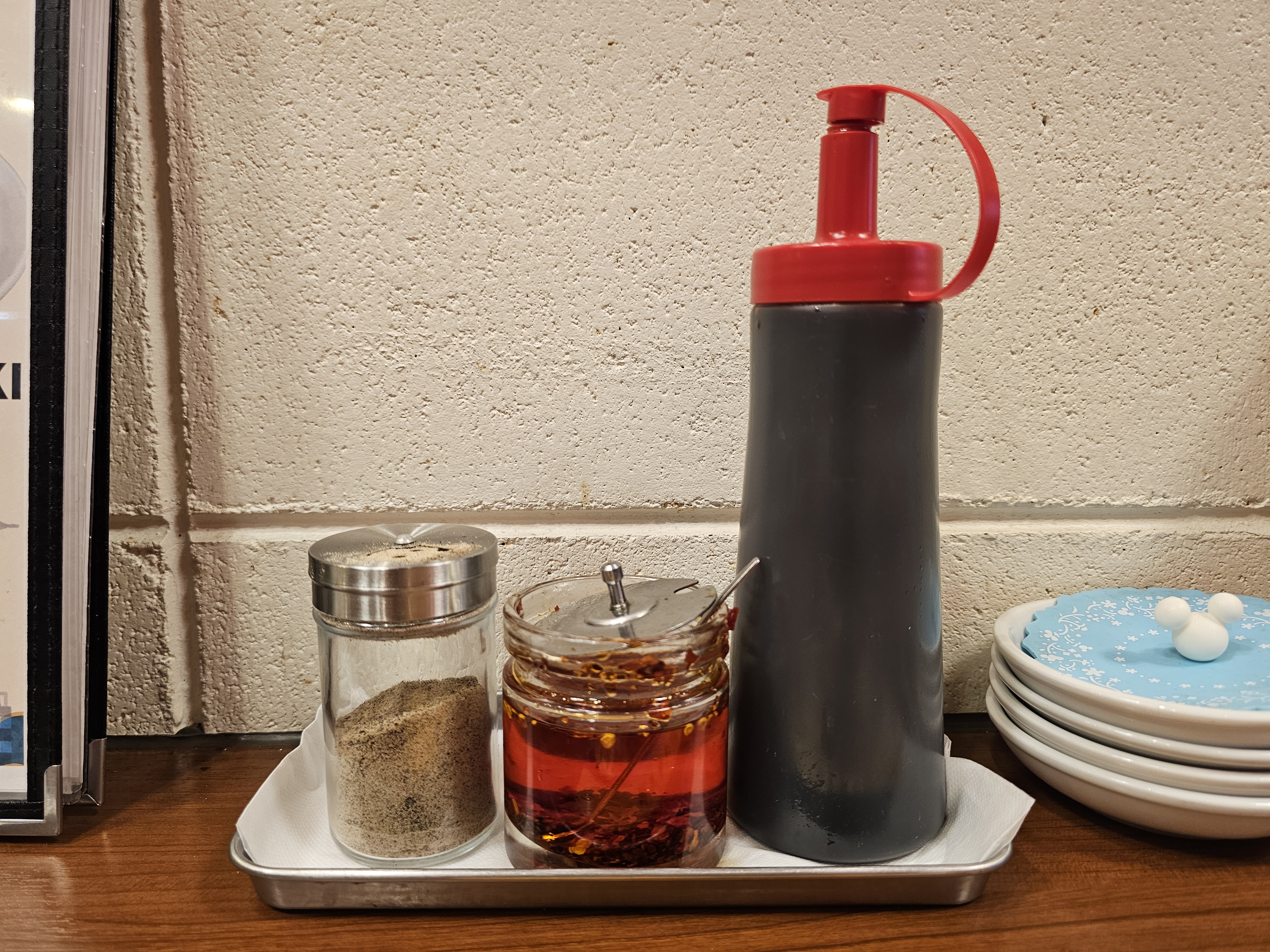 테이블에는 물통과 후추, 라유, 교자를 찍어 먹는데 사용되는 간장 소스(?)가 놓여져 있었습니다.