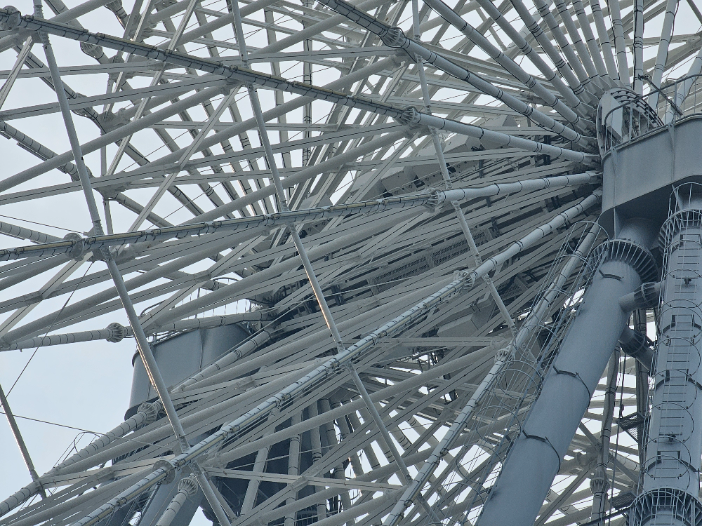 대관람차는 크게 와이어 프레임 방식과 철골 프레임 방식(?)이 있는데, 덴포잔 대관람차는 여러 개의 철골 구조물로 림을 단단하게 고정한 모습을 보여주고 있었습니다.