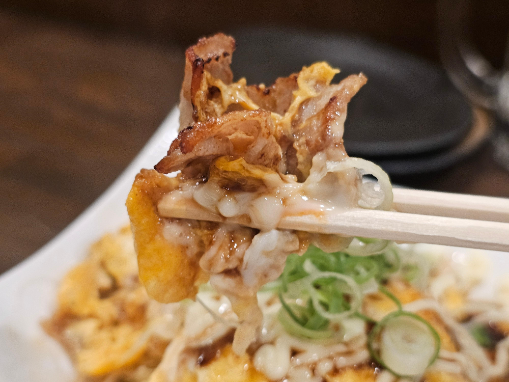 돈페이야키는 얇게 구운 돼지고기에 계란을 덮은 오사카식 요리로, 따뜻하고 짭조름한 맛이 술안주로 제격이었습니다.