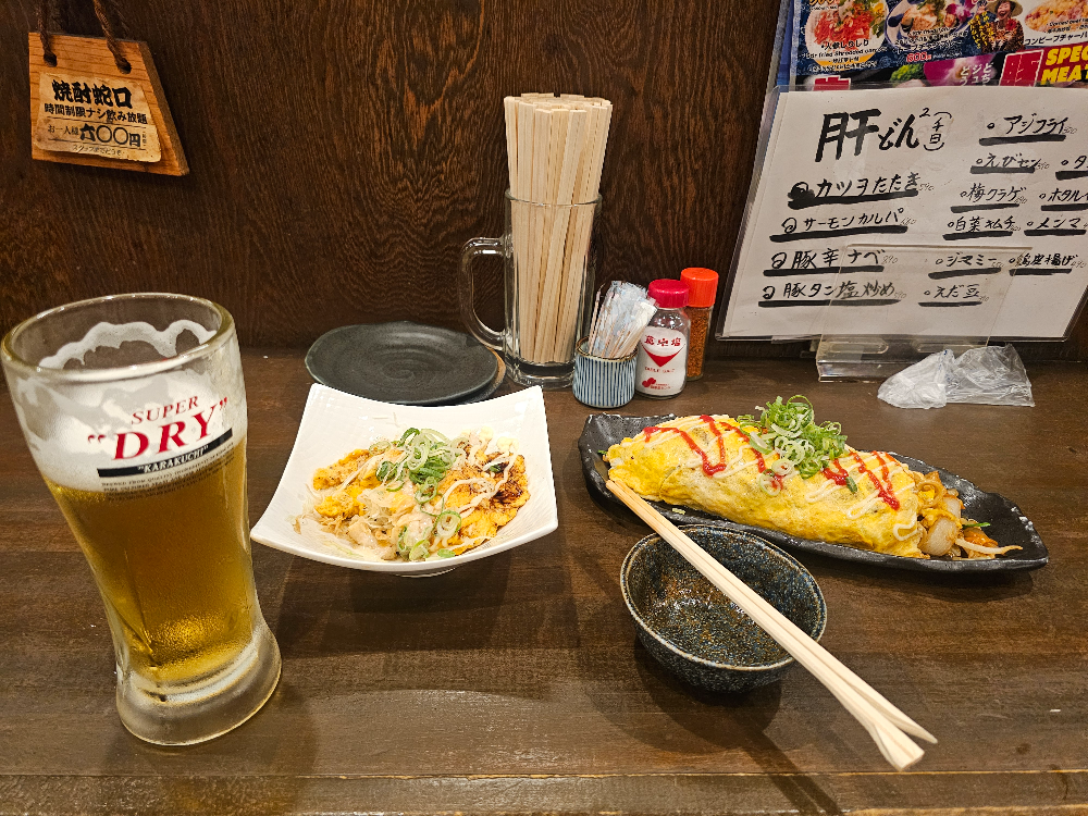 술과 함께 주문한 안주는 돈페이야키(とん平焼き)와 면이 들어 있는 오므라이스(オムそば)입니다.