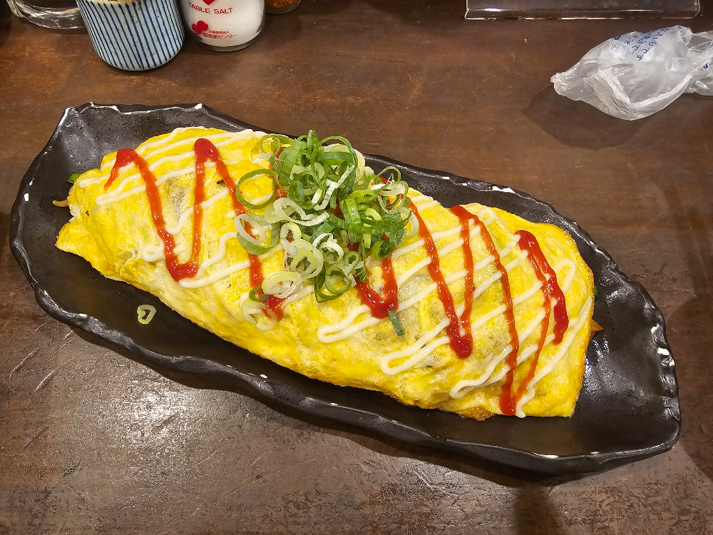 술과 함께 주문한 안주는 돈페이야키(とん平焼き)와 면이 들어 있는 오므라이스(オムそば)입니다.