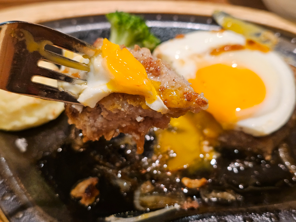 햄버그 위에 올라간 반숙 계란이 식욕을 자극합니다.