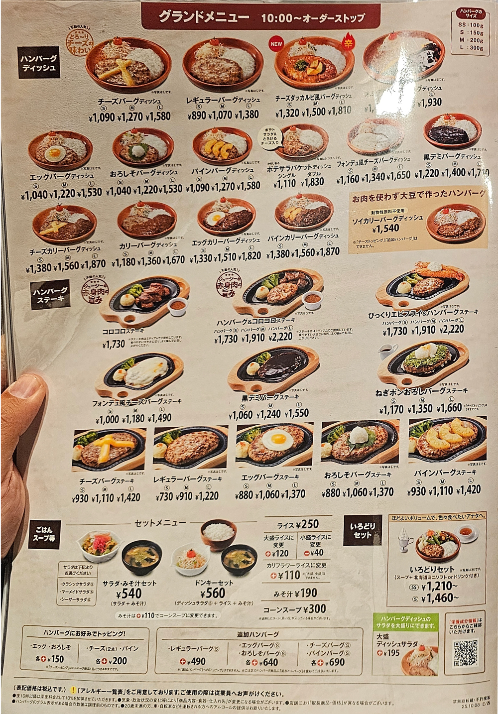 빗쿠리돈키에서는 햄버그 스테이크의 사이즈를 선택할 수 있는데 SS는 100g, S는 150g, M은 200g, L은 300g입니다.