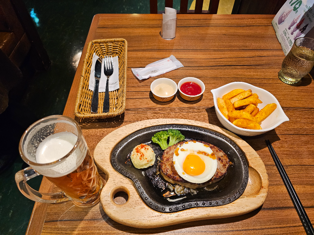저는 에그 햄버그 스테이크(エッグバーグステーキ), 매운 감자튀김(スパイシーポテト) 그리고 맥주를 주문했습니다.
