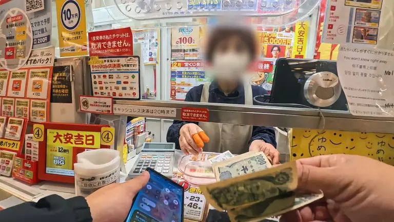 구입하고자 하는 복권을 손으로 가르키세요. 일본어를 잘 한다면 일본어로 말하시면 되겠지만 그게 어렵다면 손으로 가르키시는 것이 편합니다. 잠깐 언급했지만 일반 점보 복권과 미니 점보 복권이 있습니다. 좌판에 복권의 예시이미지 같은게 있으니 그 이미지를 가르키시면 됩니다.