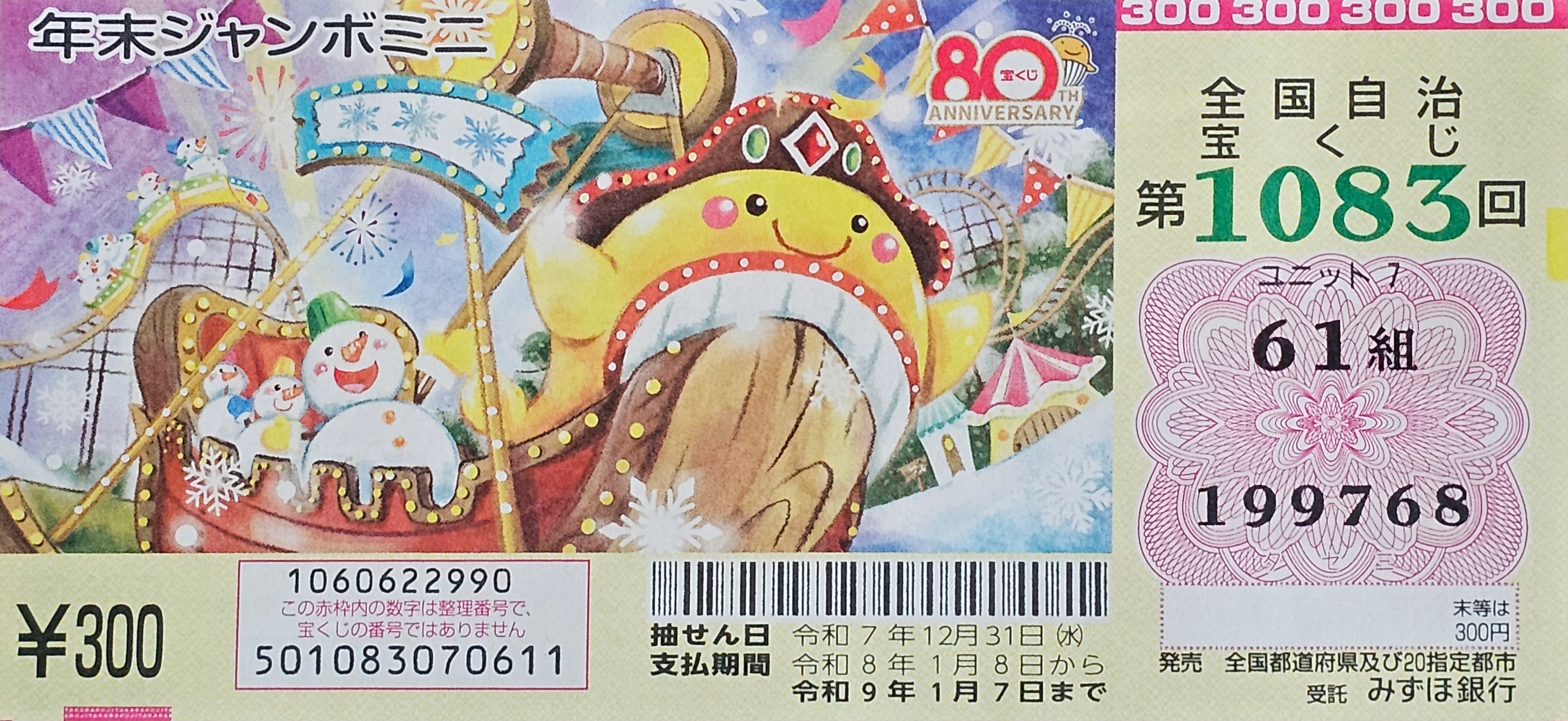 연말 점보(年末ジャンボ)는 점보 복권 중에서도 가장 규모가 크고 인기가 많다는데 1등 당첨금이 무려 7~10억 엔에 달한다고 합니다.