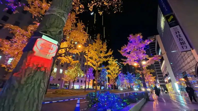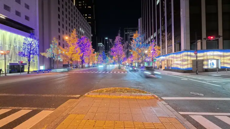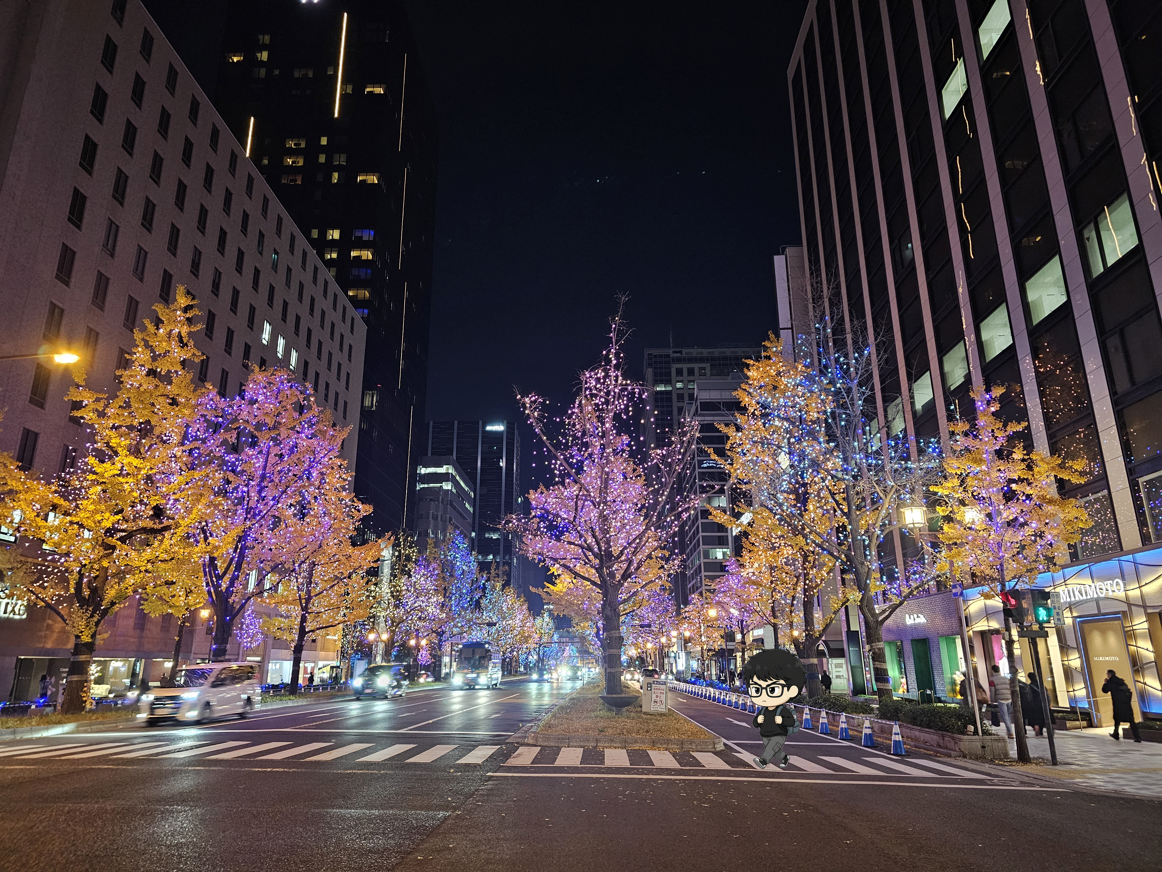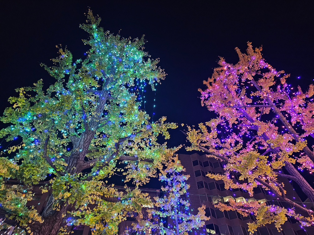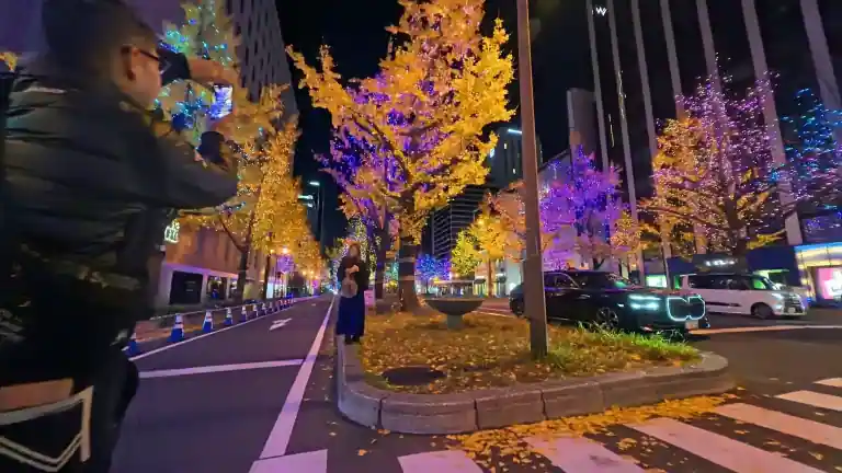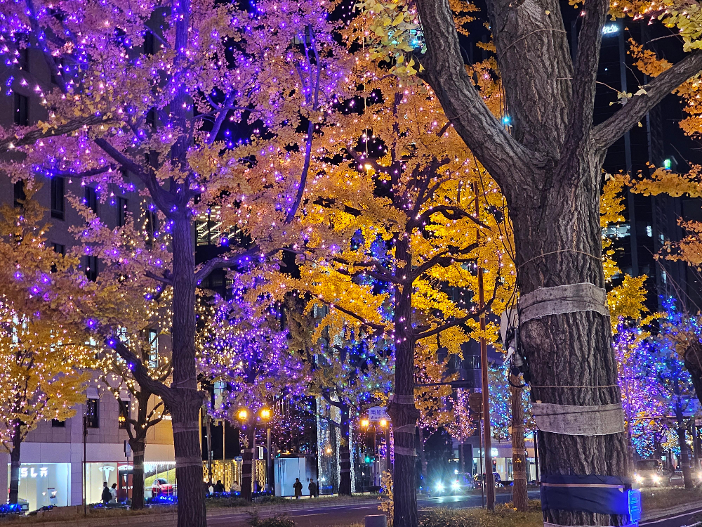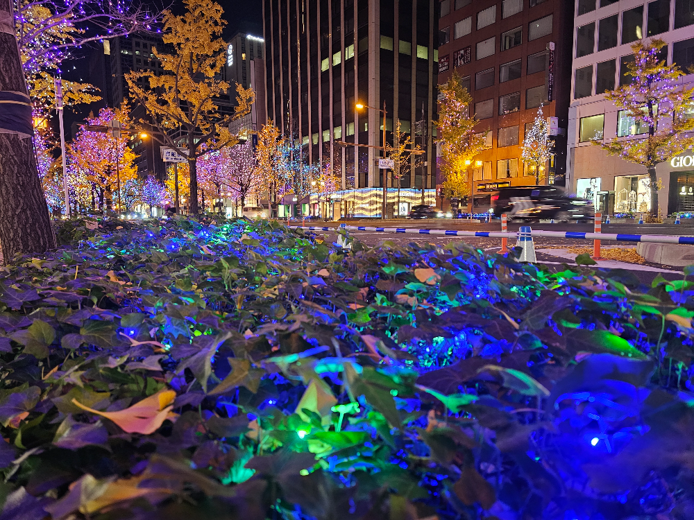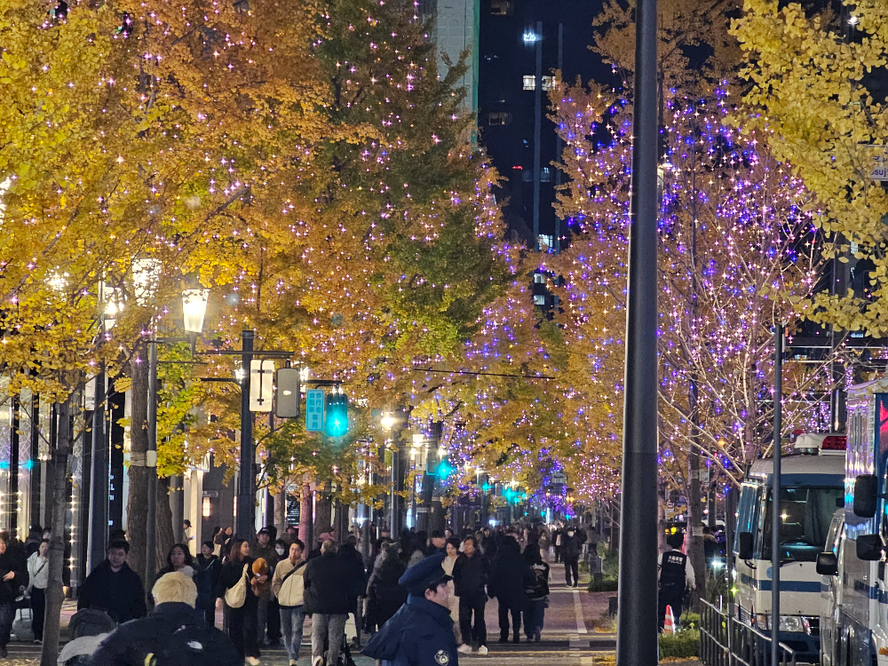 도로 양쪽으로 늘어선 은행나무들이 수십만 개의 LED 조명으로 장식되어, 마치 동화 속 한 장면처럼 로맨틱한 분위기를 자아냅니다.