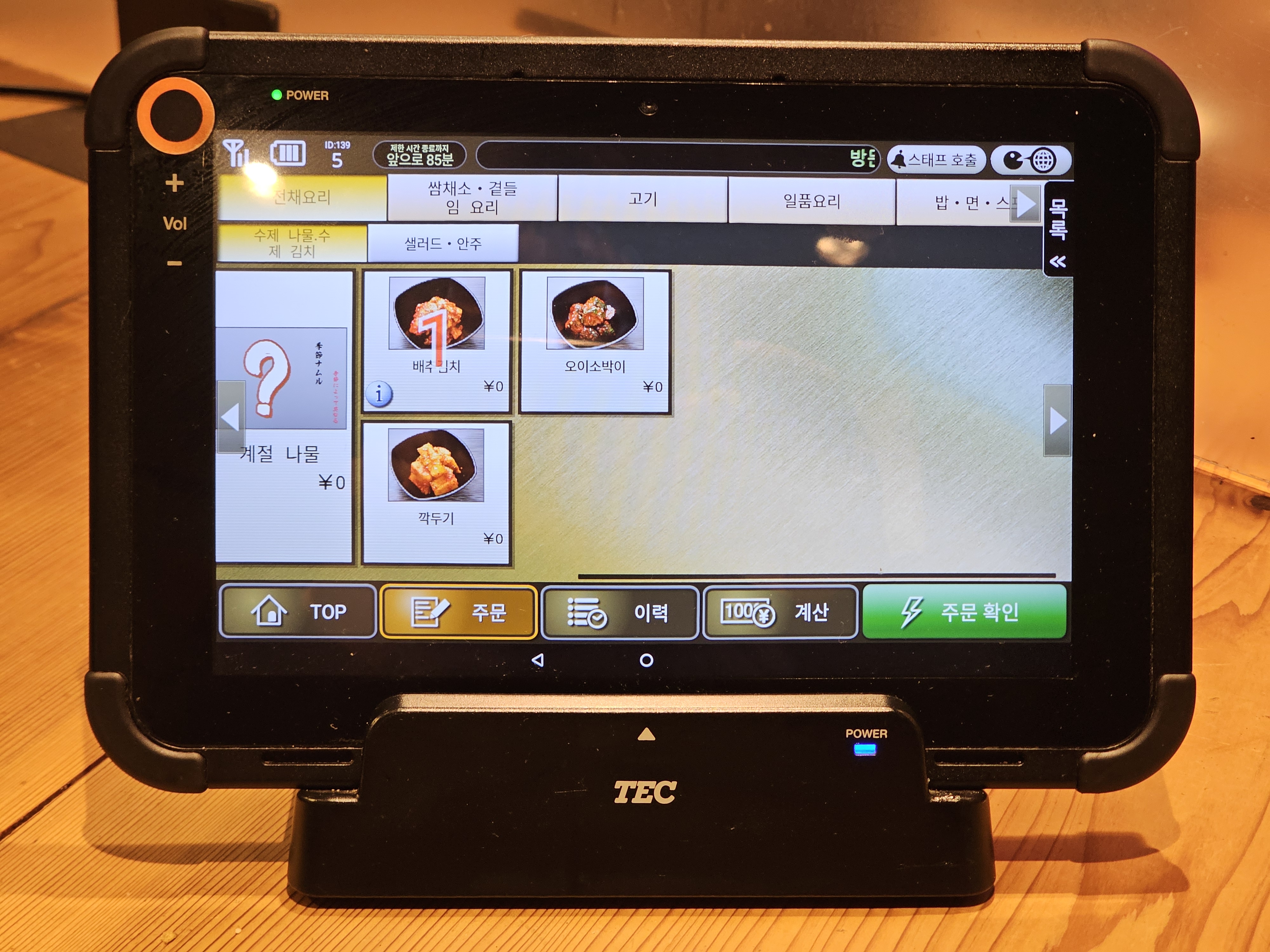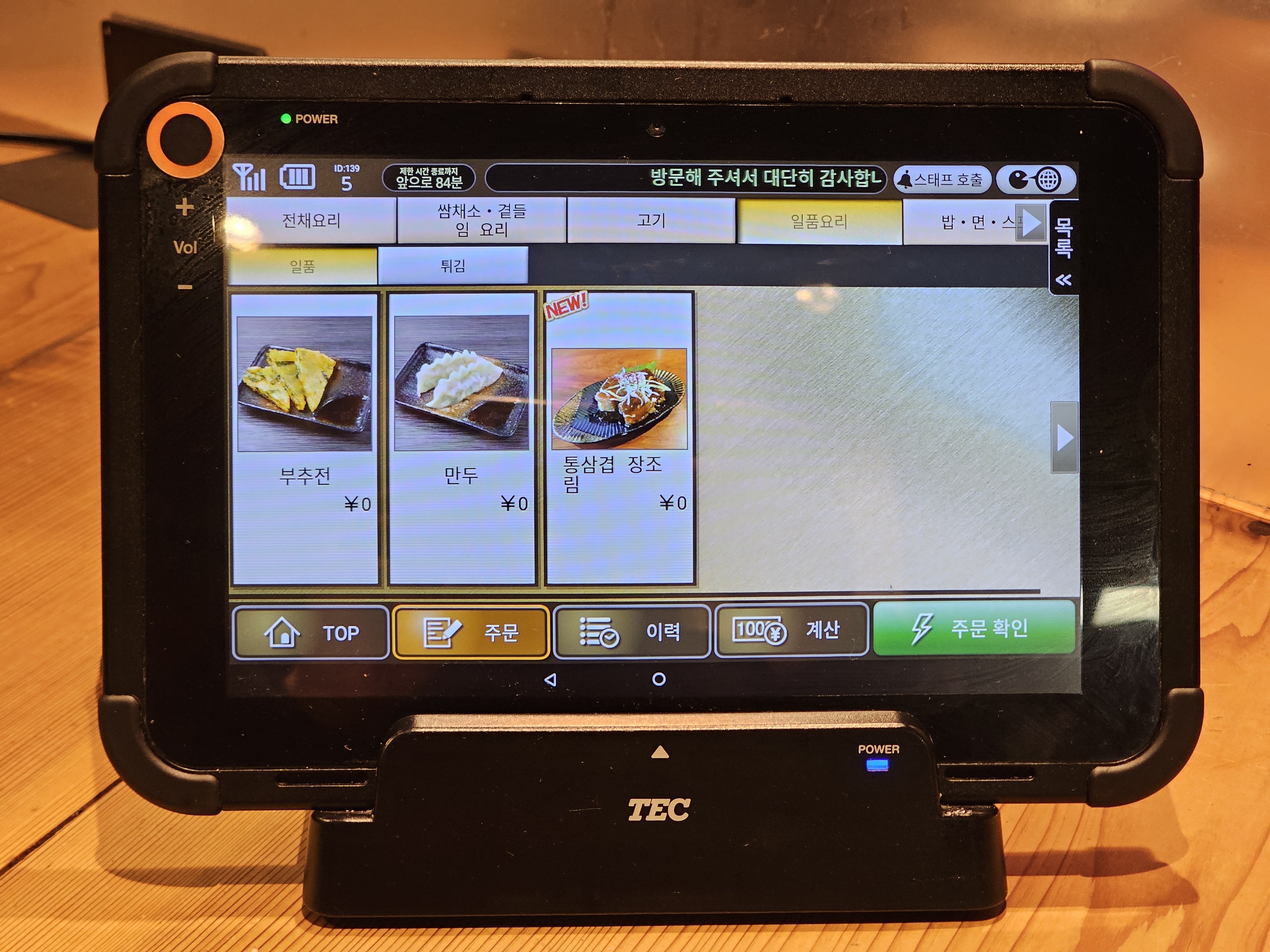120분 코스는 마지막 주문을 90분까지 진행할 수 있는데, 태블릿 좌측 상단에 이렇게 제한 시간이 표시되어 있어서 시간을 넘기면 어떻하지 고민할 필요가 없습니다.