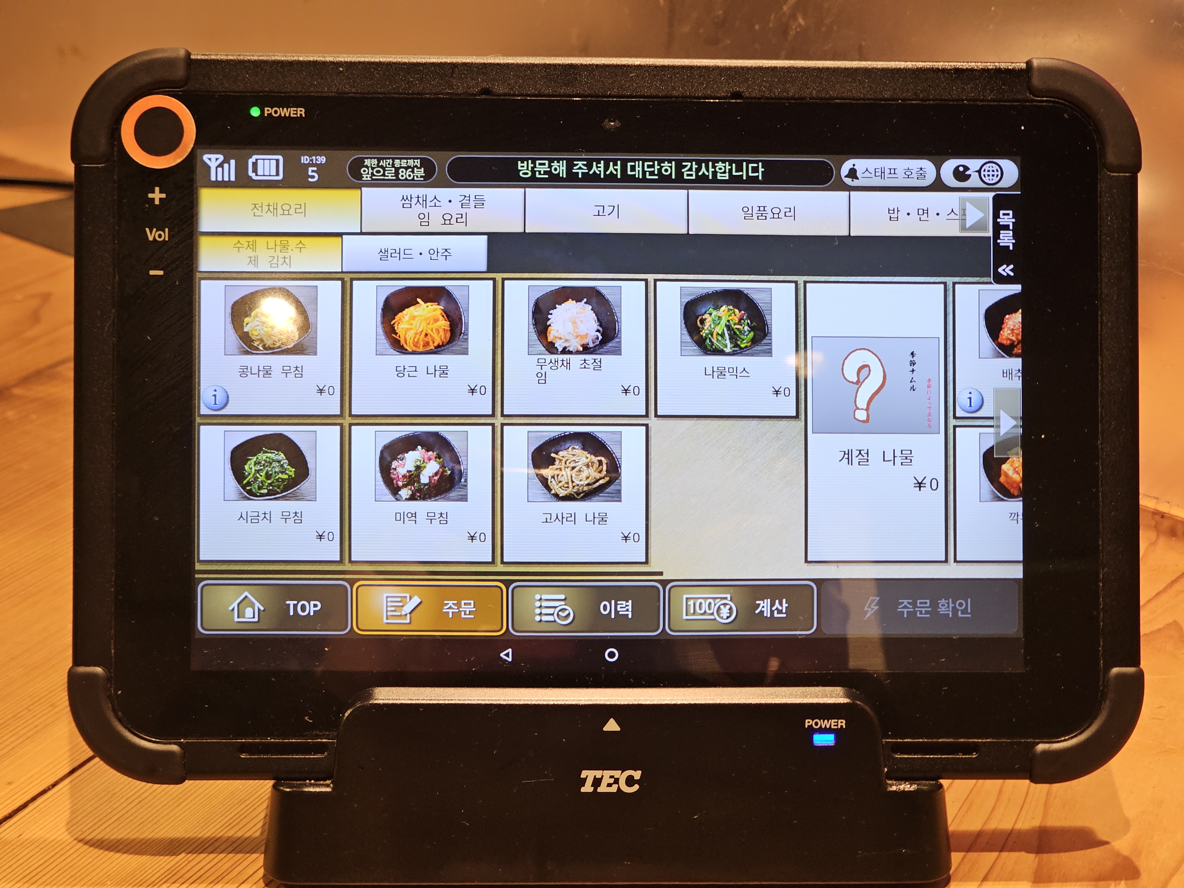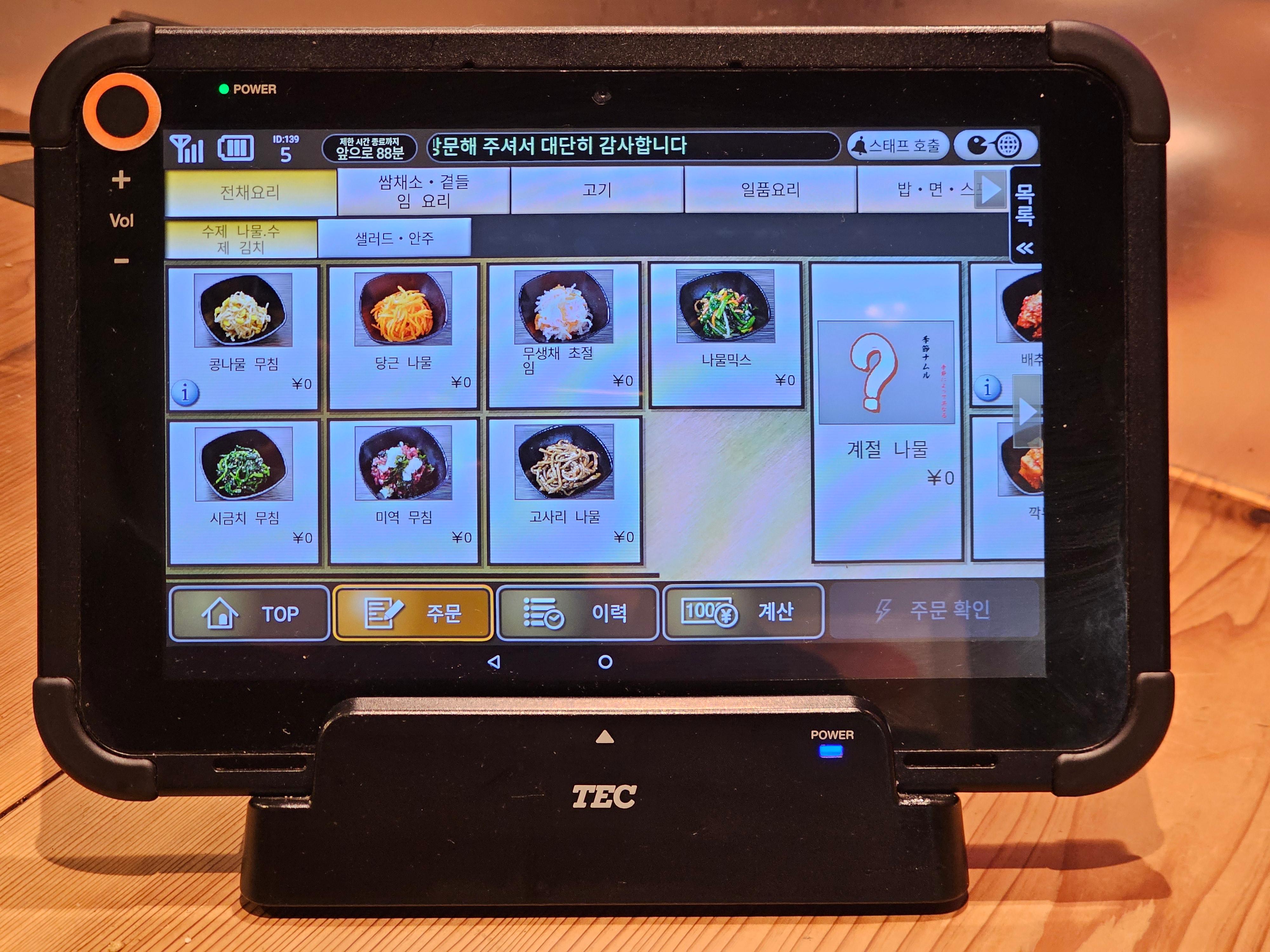 태블릿 메뉴를 보니 김치, 콩나물, 오이소박이 같은 한국식 반찬들이 꽤 많이 준비되어 있었습니다.