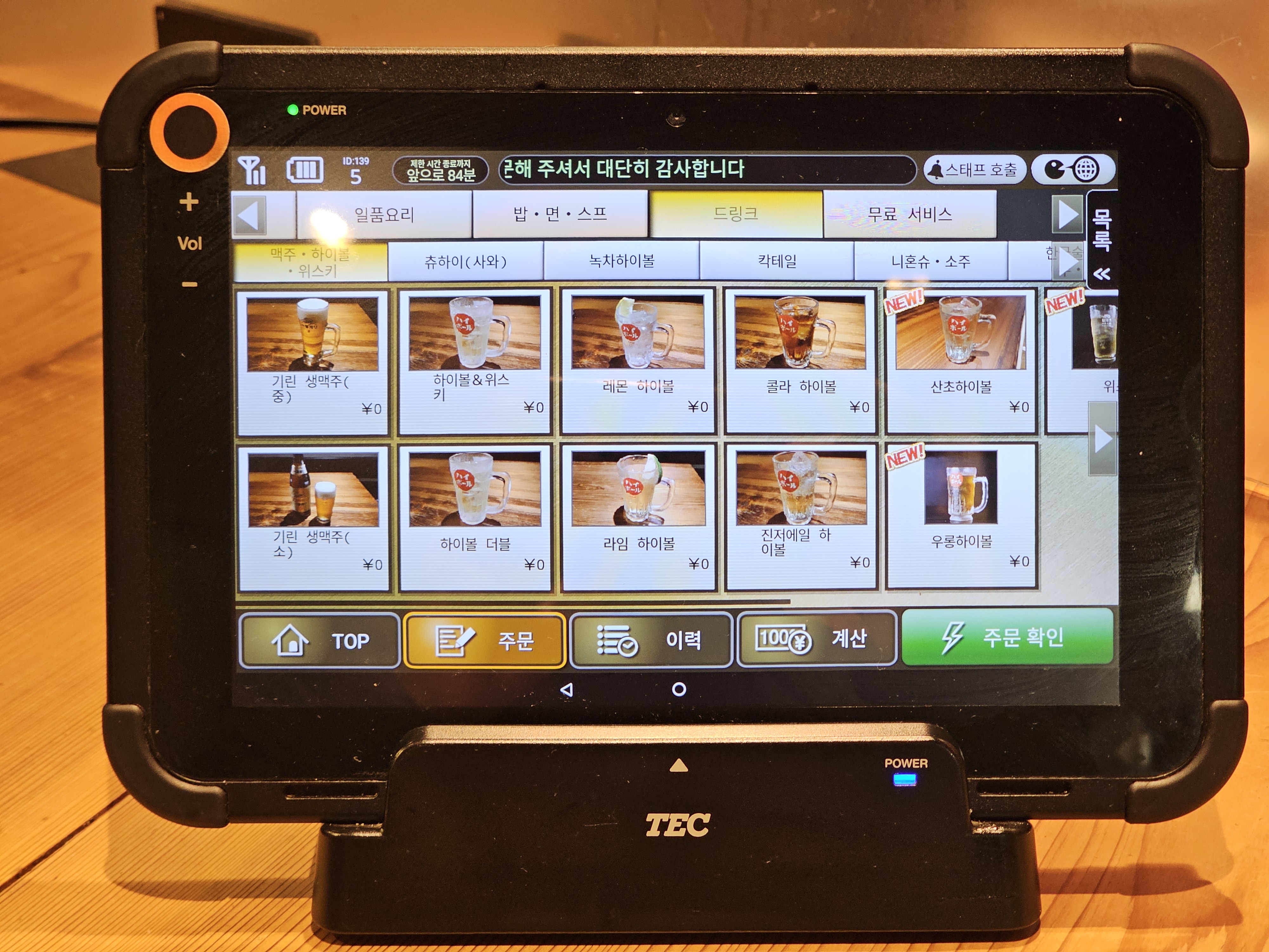 120분 코스는 마지막 주문을 90분까지 진행할 수 있는데, 태블릿 좌측 상단에 이렇게 제한 시간이 표시되어 있어서 시간을 넘기면 어떻하지 고민할 필요가 없습니다.