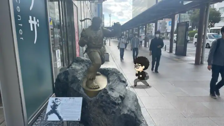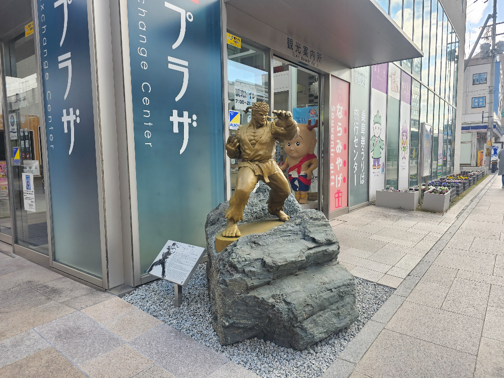 역 앞 광장으로 나가자, 일본 스모 선수 캐릭터인 에드몬드 혼다의 동상이 눈에 들어왔습니다.