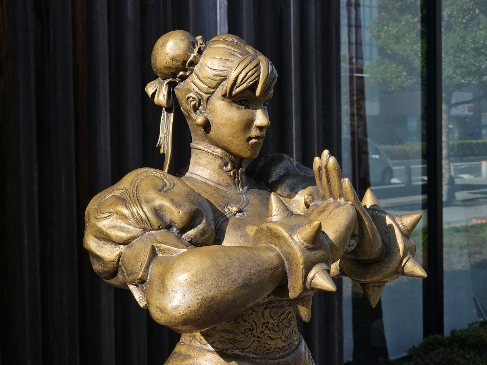 청사 현관 앞에는 스트리트 파이터의 인기 캐릭터, 춘리의 동상이 자리하고 있었습니다.