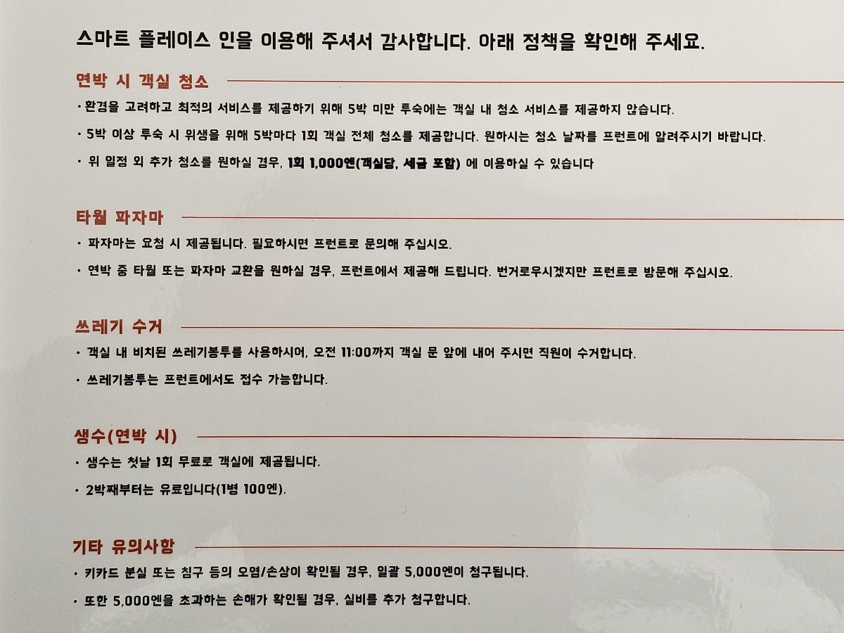 - 위 일정 외에 추가 청소를 희망할 경우, 1회당 1,000엔의 비용을 지불해야 합니다.
