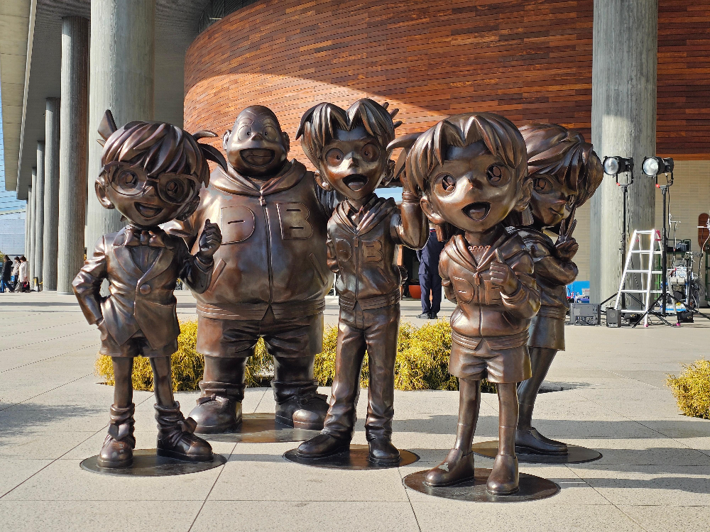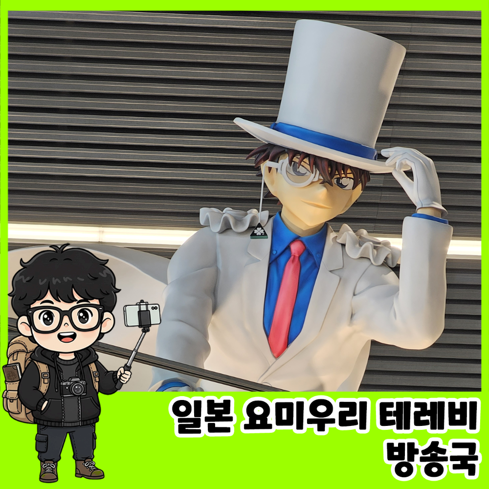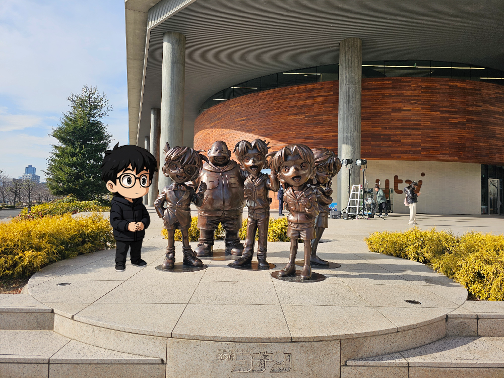 요미우리 테레비는 명탐정 코난을 방영하는 일본의 주요 방송국으로, 건물 앞에 코난 관련 조형물들이 전시되어 있었습니다.
