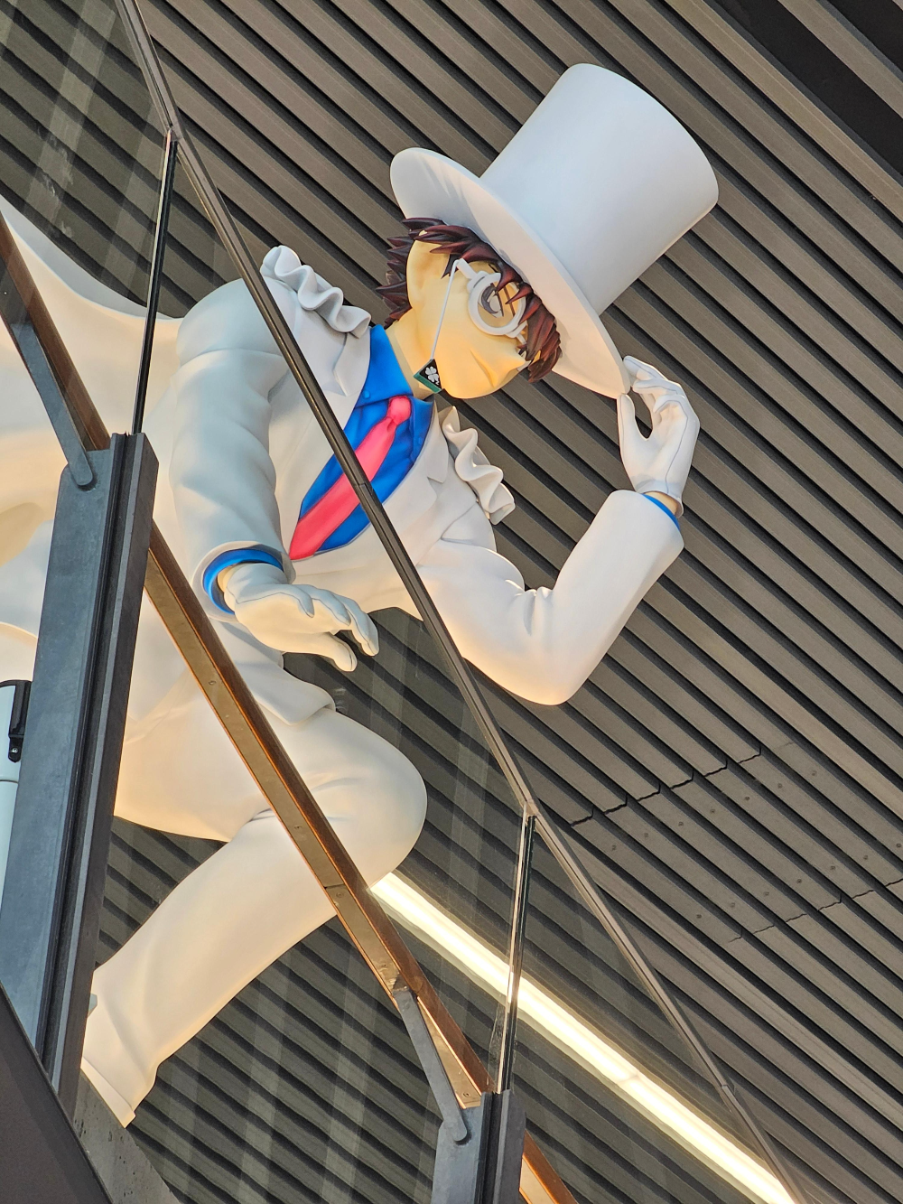 하얀 옷을 입은 괴도키드가 난간에서 우리를 내려다보는 모습의 조형물이었습니다.