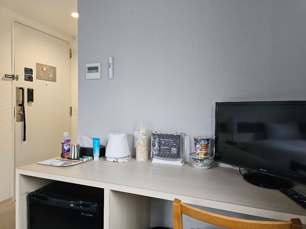 냉장고, TV, 헤어드라이어가 기본으로 갖춰져 있었고, 일본의 여느 비즈니스 호텔과 비슷한 크기지만 공간 활용이 잘 되어 있어서 좁다는 느낌이 없었습니다.