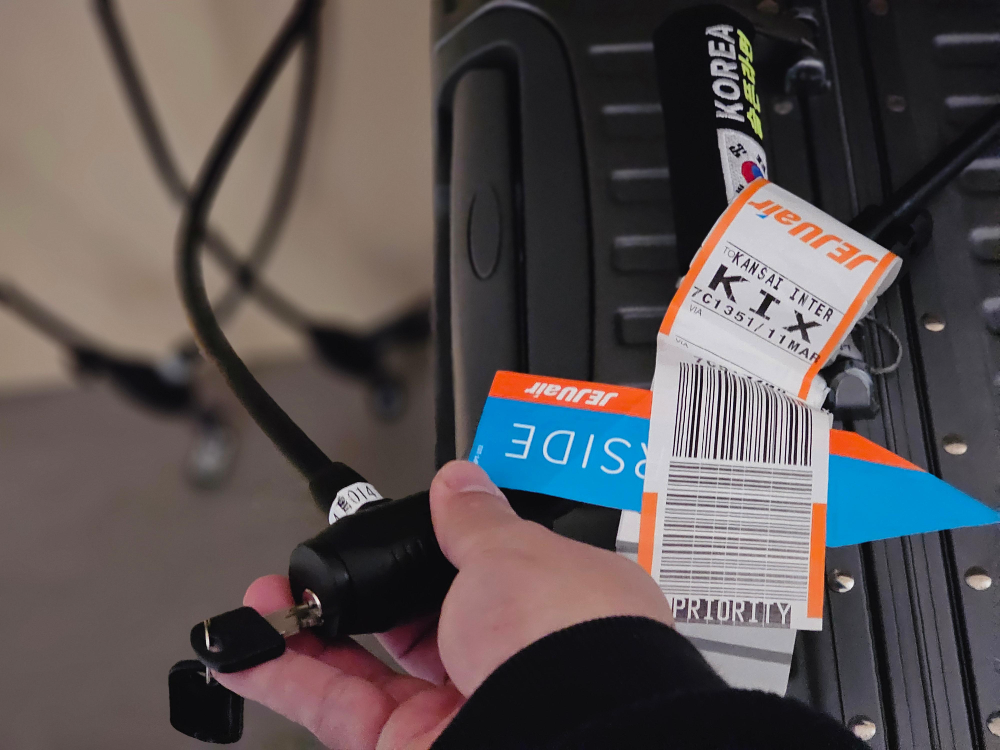 자전거 자물쇠 형태의 잠금 장치들이 여럿 비치되어 있어서, 그중 하나를 골라 캐리어에 채우고 열쇠를 직접 챙기는 방식입니다.