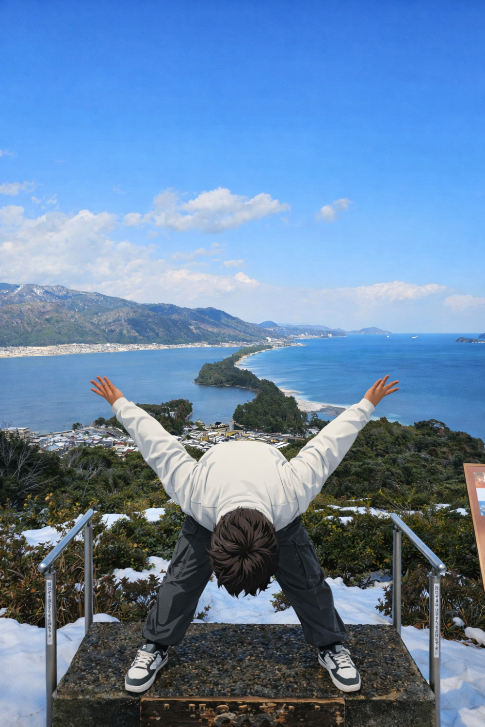 아마노하시다테 뷰랜드에서 가장 유명한 것은 전망 그 자체가 아니라 마타노조키(股のぞき)라는 독특한 체험입니다.