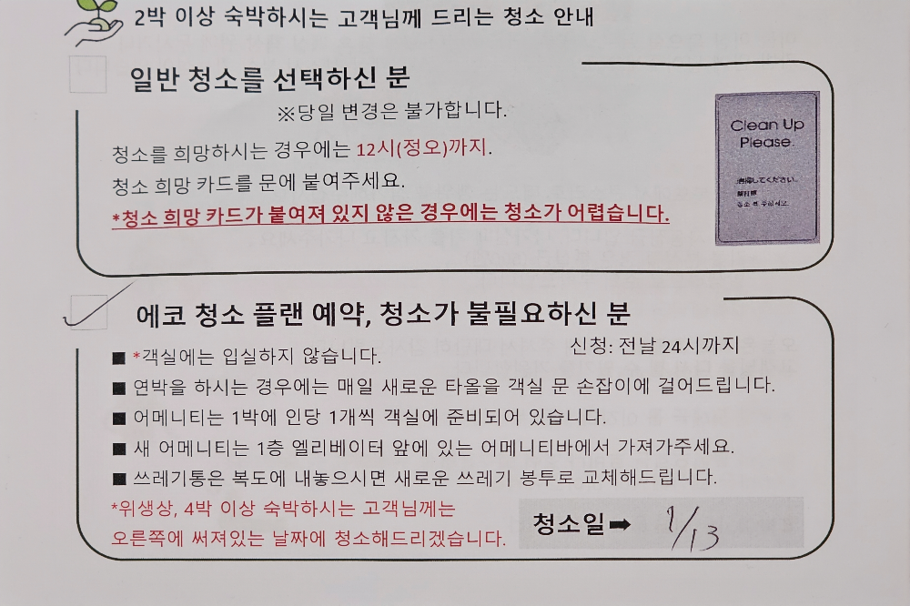이번 투숙은 연박으로 진행했으며, 에코 청소 플랜을 선택하였습니다.