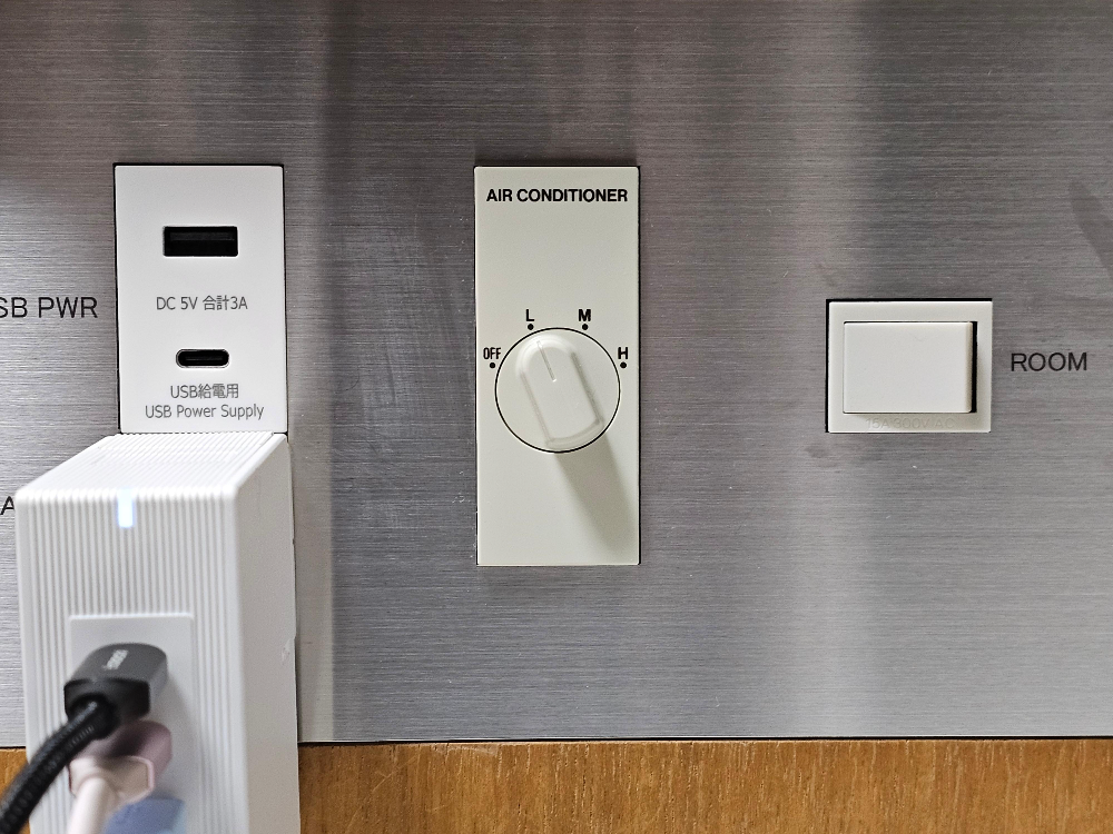 침대 머리 맡에 에어컨 바람 세기 조절 다이얼과 USB A Type과 C Type 충전 포트 각 1구, 전기 포트 1구, 조명 컨트롤 버튼이 있어서 누운 채로 편리하게 조작 가능했습니다. 이 부분은 정말 마음에 들었습니다.