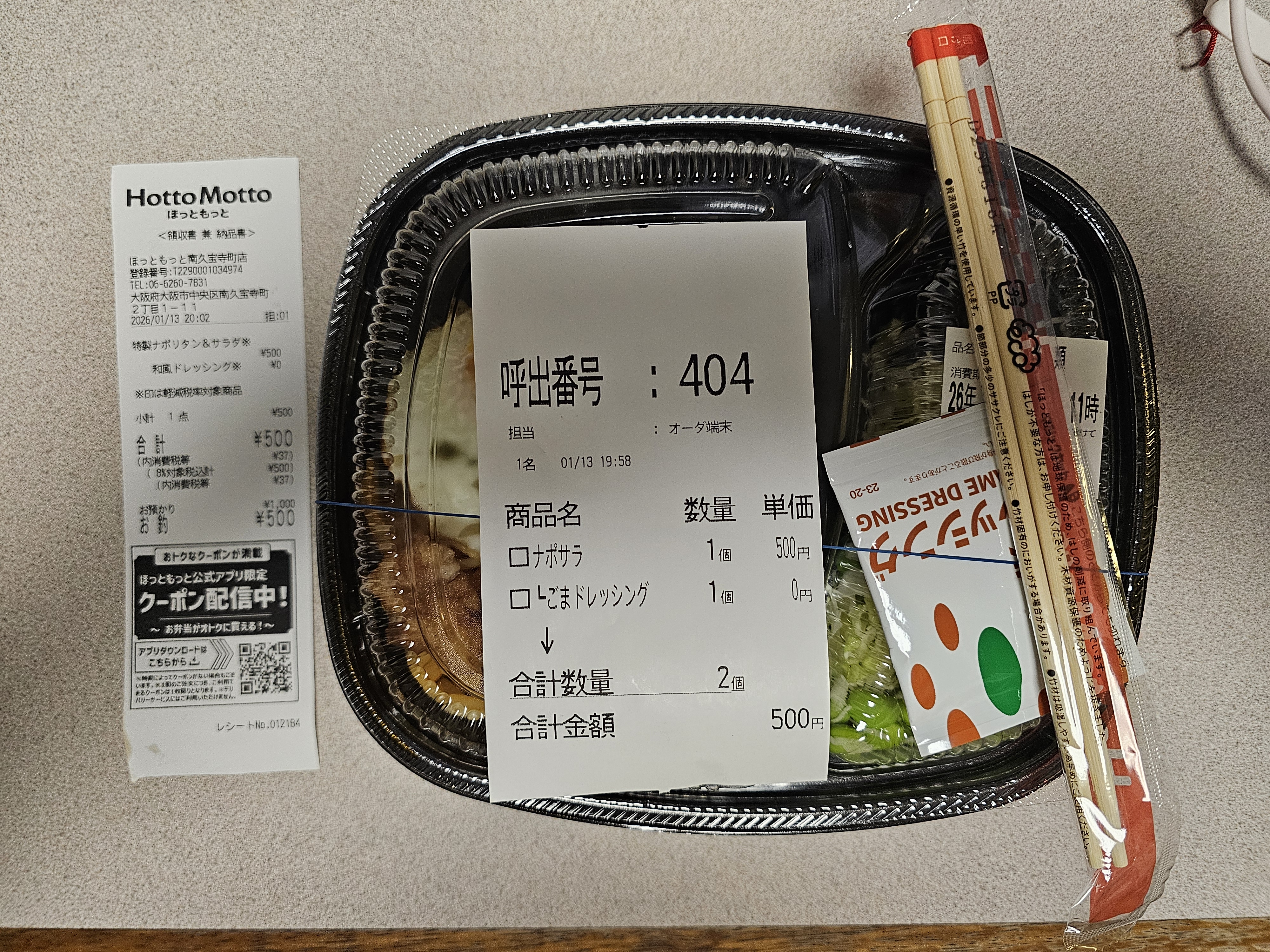 가격은 단돈 ¥500(약 4,500원)이었으며, 드레싱은 화풍(和風) 드레싱을 선택했습니다. 드레싱은 별도 요금 없이 선택 가능합니다.